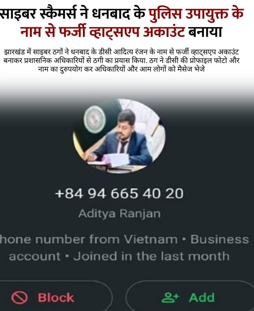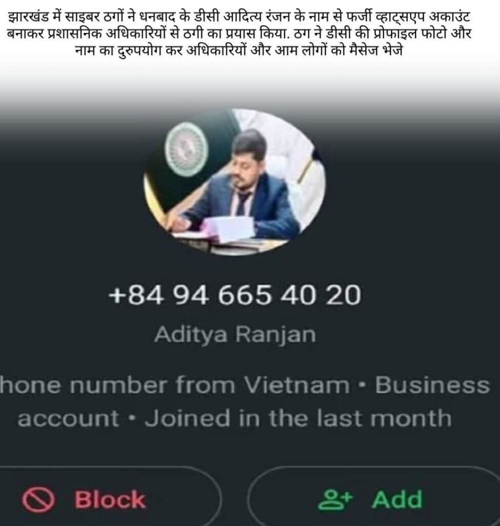 धनबाद, 21 जनवरी 2026:धनबाद के उपायुक्त सह जिला दंडाधिकारी श्री आदित्य रंजन के नाम और प्रोफाइल फोटो का दुरुपयोग कर साइबर अपराधियों द्वारा एक फर्जी व्हाट्सएप अकाउंट बनाए जाने का मामला सामने आया है। यह फर्जी अकाउंट मोबाइल नंबर (+84 946654020) से संचालित किया जा रहा है।