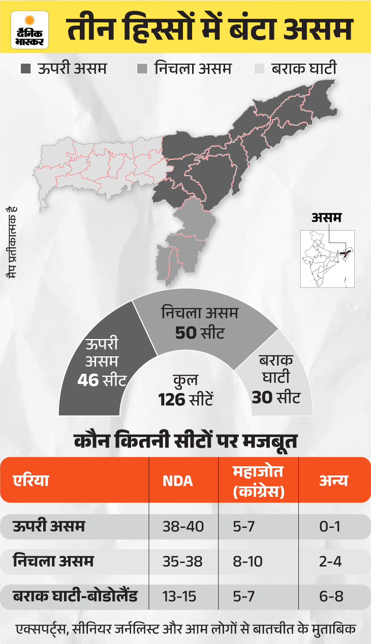 असम तीन हिस्सों ऊपरी असम, निचला असम और बराक घाटी में बंटा है। ऊपरी असम में 46 सीटें हैं। यहां चाय बागान और असमिया पहचान सबसे बड़ा मुद्दा हैं। निचले असम में 50 सीटें हैं। बांग्लादेश बॉर्डर वाले इस इलाके में मियां मुसलमानों की आबादी ज्यादा है। बराक घाटी और आसपास के इलाके में 30 सीटें हैं। ये इलाका भाषाई और जनजातीय पहचान के लिए जाना जाता है।