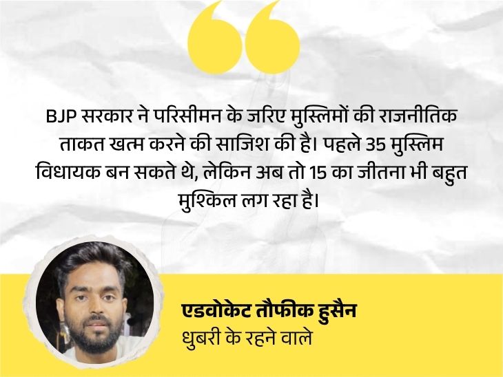 एडवोकेट तौफीक हुसैन के मुताबिक, परिसीमन में दो तरीके अपनाए गए। मुस्लिम आबादी वाले बड़े इलाके को दो से तीन सीटों में बांट दिया। इससे मुस्लिम वोट बंट गए। दूसरे तरीके में अलग-अलग जगहों पर बिखरी मुस्लिम आबादी को समेटकर एक सीट में कर दिया। पहले मुस्लिम वोटर तीन सीटों पर असर डालते थे, अब एक सीट पर बड़े अंतर से जीतेंगे, लेकिन बाकी दो सीटों से कंट्रोल खत्म हो गया।
