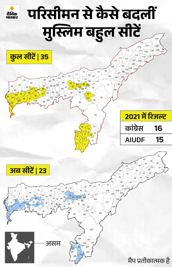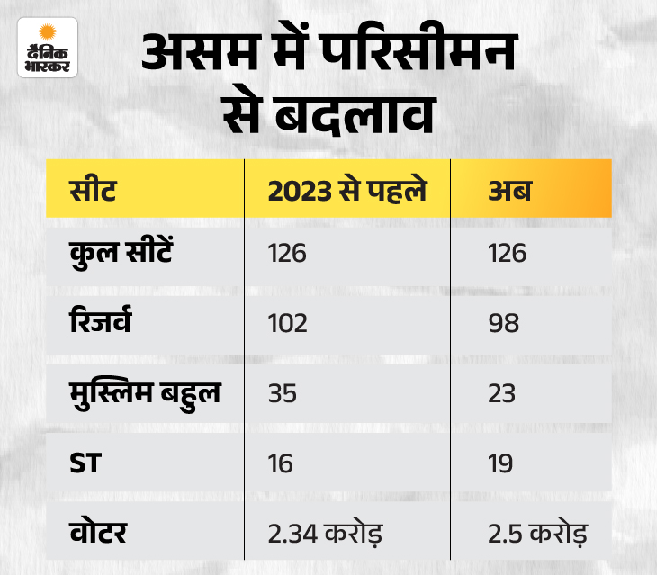 चुनाव आयोग ने 2023 में परिसीमन किया था। इसका असर मुस्लिम बहुल सीटों पर ज्यादा पड़ा है। पहले 126 विधानसभा सीटों में लगभग 35 सीटें मुस्लिम बहुल थीं। अब 23 रह गई हैं।