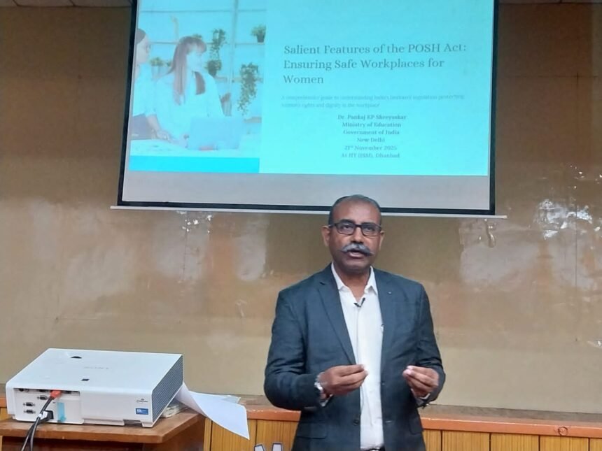 धनबाद, 21 नवंबर 2025:आईआईटी आईएसएम धनबाद में “बिल्डिंग सेफर वर्कप्लेस: अंडरस्टैंडिंग द पोश एक्ट, 2013” विषय पर जागरूकता कार्यशाला आयोजित हुई। जीजेएलटी में शाम 4 से 6 बजे तक आयोजित इस कार्यक्रम में मुख्य संसाधक के रूप में शिक्षा मंत्रालय, भारत सरकार के डॉ. पंकज के. पी. श्रेयस्कर उपस्थित रहे। कार्यशाला में कर्मचारियों, छात्रों, शोधार्थियों व प्रोजेक्ट स्टाफ ने बढ़-चढ़कर हिस्सा लिया।