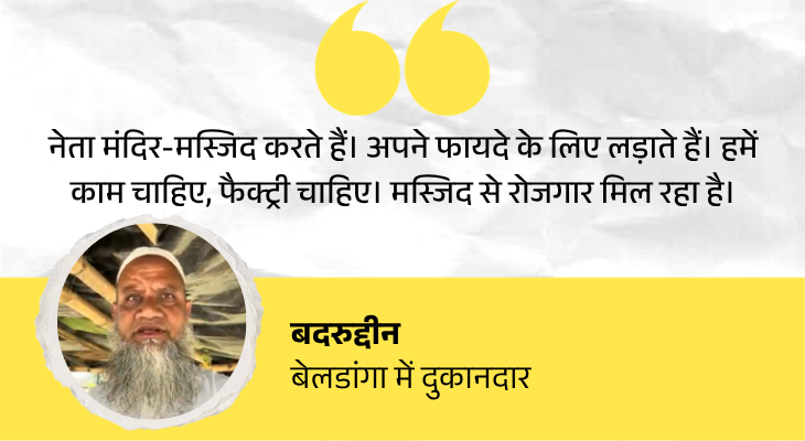बदरुद्दीन पहले मुंबई में काम करते थे। पता चला कि बेलडांगा में बाबरी मस्जिद बनने वाली है, इसलिए घर लौट आए। तिरपाल और बांस-बल्ली से दुकान बनाई और जूस बेचने लगे। हमने पूछा मस्जिद से क्या फायदा मिल रहा है, क्या इसके नाम पर वोट भी देंगे।