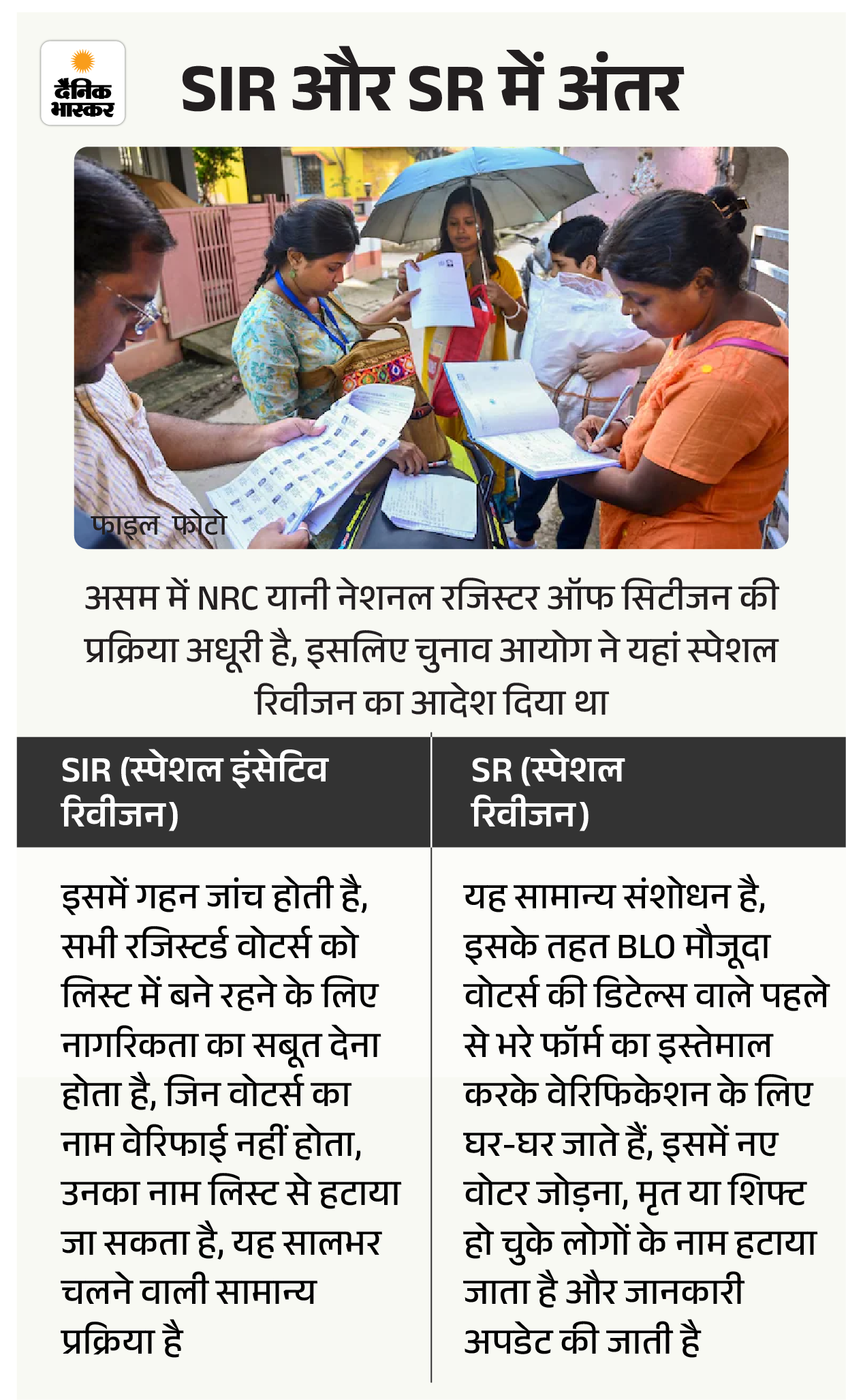 एक फैसला चुनाव आयोग का बाकी राज्यों में SIR, लेकिन असम में SR देशभर में वोटर की पहचान के लिए स्पेशल इंसेंटिव रिवीजन, यानी SIR की प्रोसेस चल रही है। असम को इससे बाहर रखा गया। चुनाव आयोग ने कहा कि राज्य में चल रही NRC, यानी नेशनल रजिस्टर ऑफ सिटीजन की प्रक्रिया अब तक पूरी नहीं हुई है। इसके बाद सिर्फ 10 दिन के अंदर 17 नवंबर 2025 को चुनाव आयोग ने असम में स्पेशल रिवीजन यानी SR कराने का आदेश जारी कर दिया।