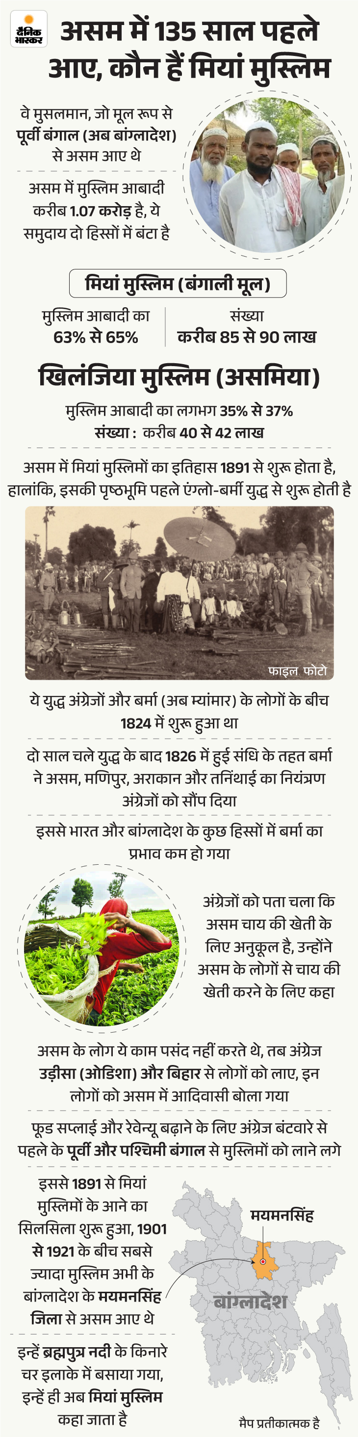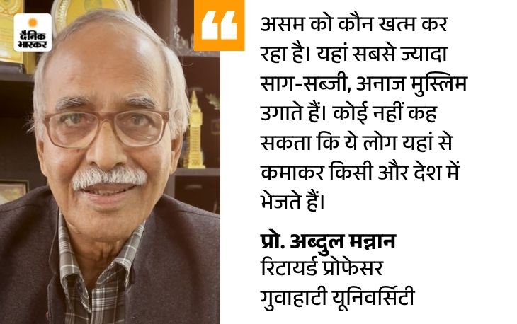 असमिया मुस्लिम बोले- मियां मुस्लिम हमारी जमीन हड़प रहे कामरूप जिले के सोयगांव में रहने वाले अबुल कासिम असमिया मुस्लिम हैं। वे कहते हैं, ‘हमारे गांव में बांग्लादेशी घुसपैठिए (मियां मुस्लिम) रहते हैं। उन लोगों ने हमारी जमीन हड़प ली। कोर्ट में केस चल रहा है। जमीनों का टैक्स हम भरते हैं, लेकिन रहते वे हैं। हम सब हिंदू-मुस्लिम गोरिया- मोरिया भाई-भाई हैं, लेकिन मियां मुस्लिम के साथ नहीं हैं।’
