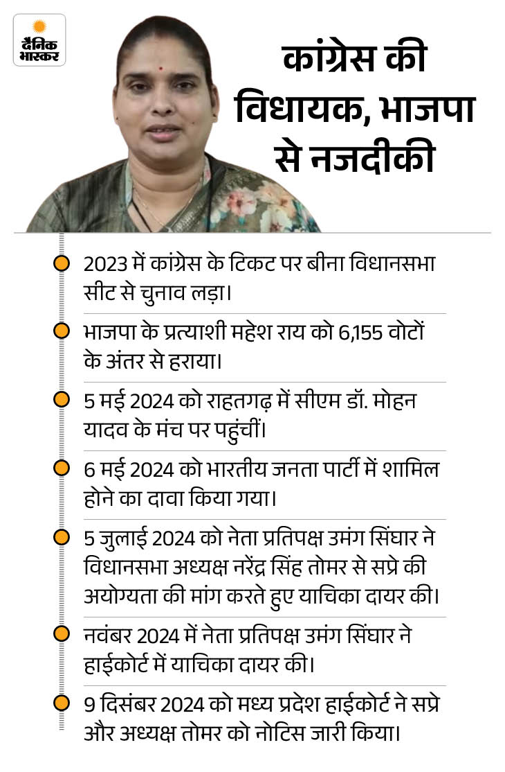 मंगलवार को चीफ जस्टिस संजीव सचदेवा और जस्टिस विनय सराफ की डिवीजन बेंच ने सुनवाई की। इसमें निर्मला सप्रे के वकील संजय अग्रवाल ने उनके कांग्रेस में ही होने का दावा किया। कहा कि ऐसे में सप्रे की विधानसभा सदस्यता को समाप्त करने का सवाल ही नहीं उठता।