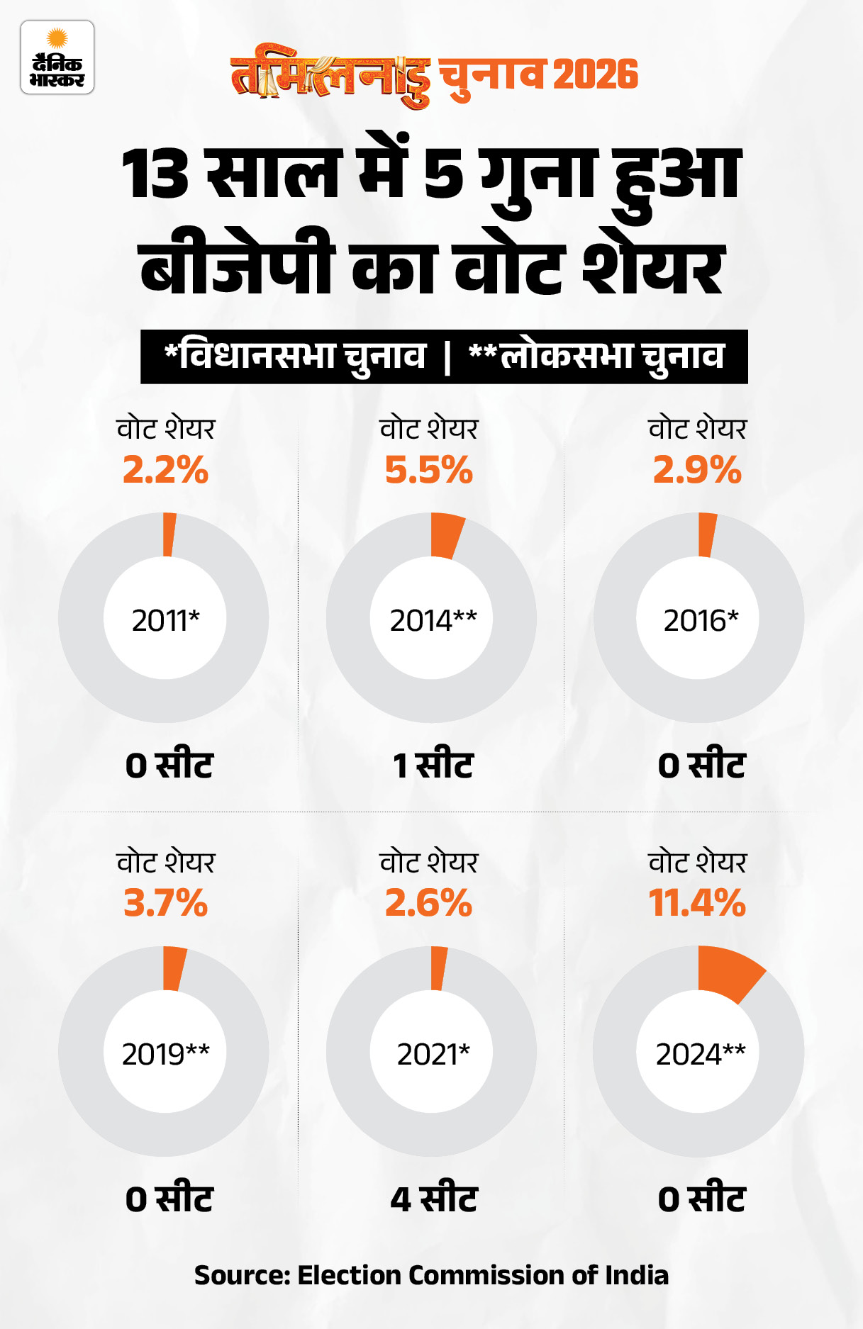 • कुछ साल बाद बीजेपी और AIADMK का गठजोड़ हुआ। इसके चलते 2021 में बीजेपी को फिर से 4 सीटें मिलीं, लेकिन सत्ता DMK के एमके स्टालिन ने संभाली।
