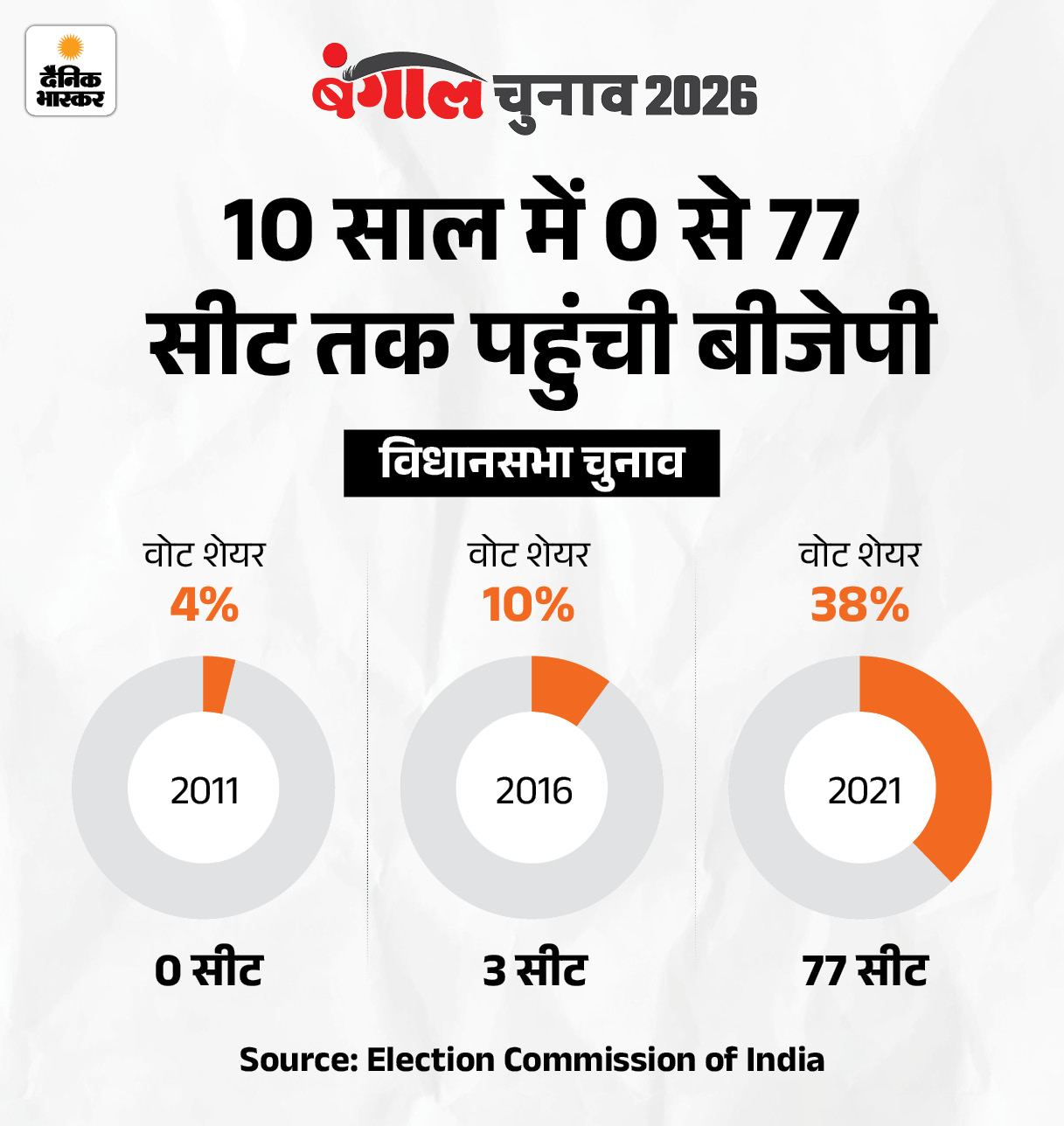 • 2019 के लोकसभा चुनाव में बीजेपी ने 42 में से 18 सीटें जीत लीं। 2021 के विधानसभा चुनाव में बीजेपी ने 38% वोटों के साथ रिकॉर्ड 77 सीटें जीती। TMC को 48% वोटों के साथ 215 सीटें मिलीं। बीजेपी विपक्ष में बैठी।