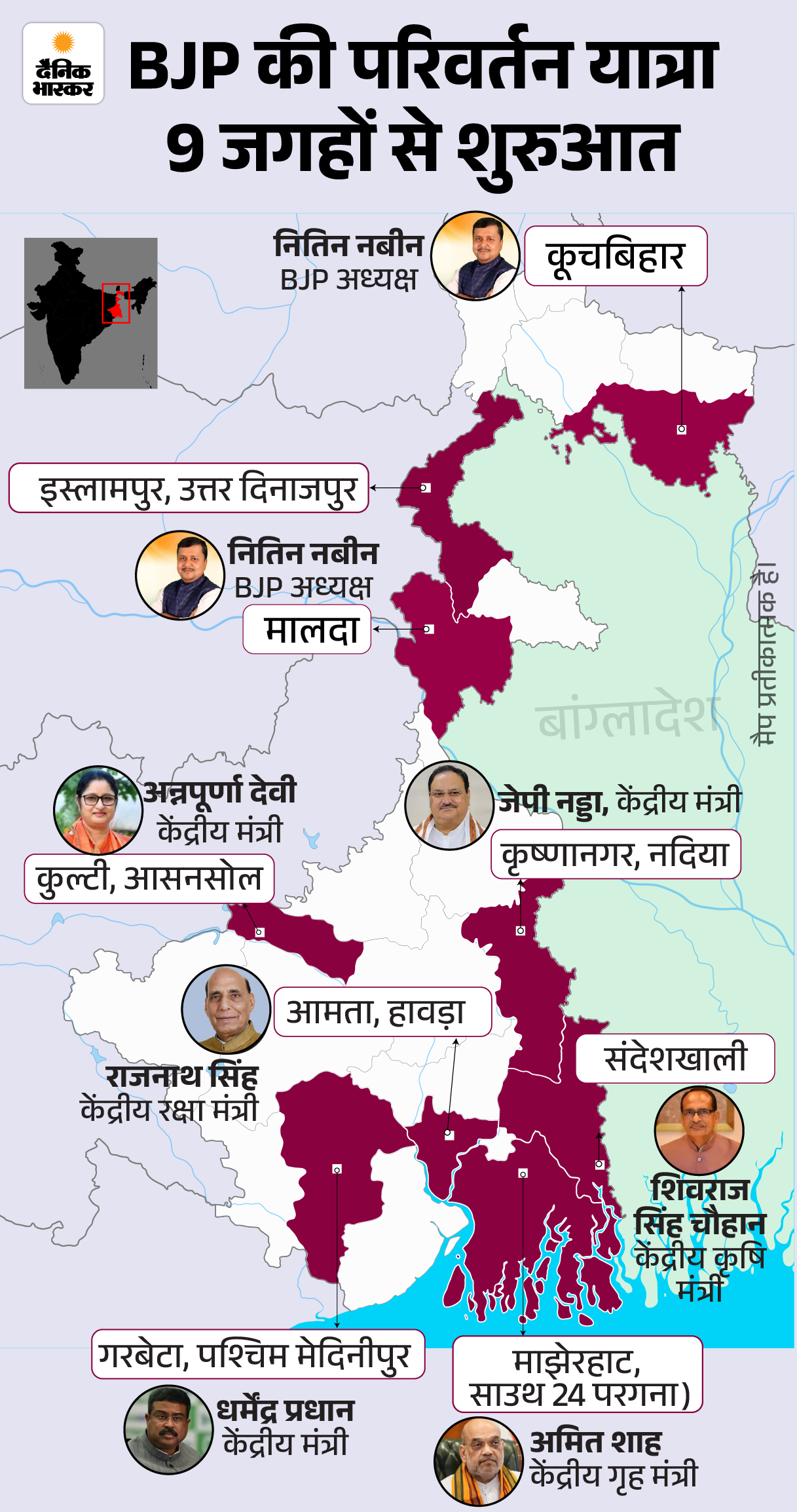1 मार्च को BJP तो 2 मार्च को TMC के इलाके से शुरुआत BJP ने 1 मार्च को जिन चार जगहों से रैली शुरू की, वहां पार्टी की अच्छी पकड़ है। 2021 के विधानसभा चुनाव में BJP ने यहां सीटें भी जीतीं। कूचबिहार की दोनों और कुल्टी की एक सीट BJP के पास है। वहीं नदिया जिले में 17 सीटों में 9 BJP के पास है।