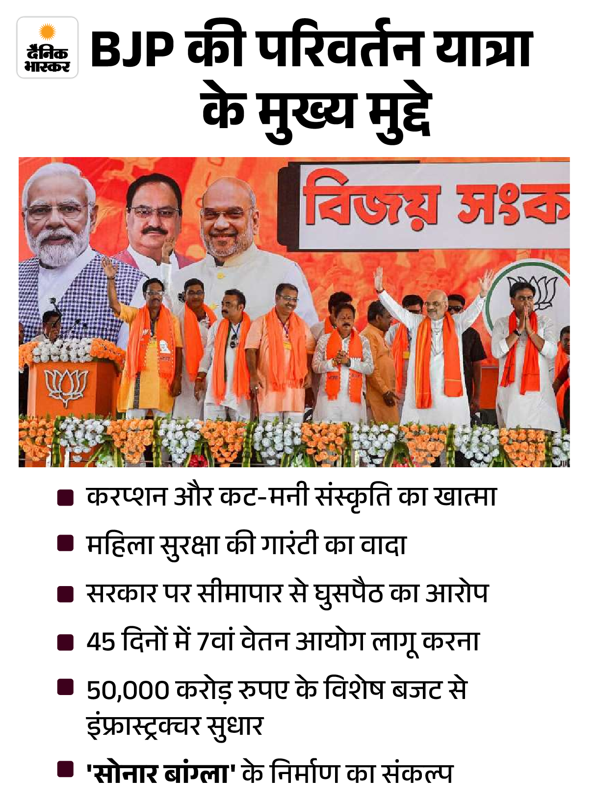 दैनिक भास्कर की टीम ने इस यात्रा को दो हिस्सों साउथ-वेस्ट बंगाल और नॉर्थ बंगाल से कवर किया। परिवर्तन यात्रा के मुद्दे और मकसद क्या रहे। जिन इलाकों से ये गुजरी, वहां पर इसका कितना असर है? विधानसभा चुनाव में इससे BJP को कितना फायदा होने वाला है? ग्राउंड पर पहुंचकर हमने समझने की कोशिश की।