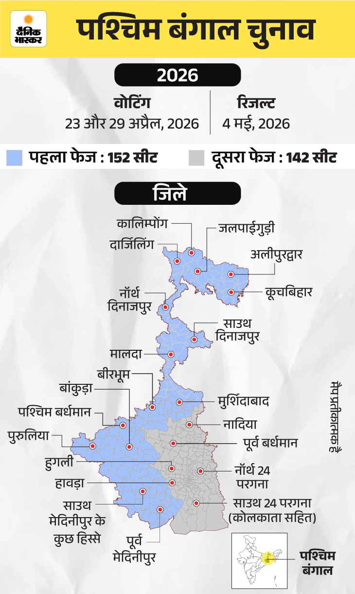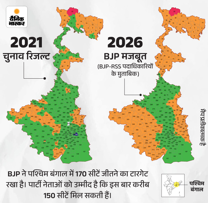 2021 के विधानसभा चुनाव में BJP नॉर्थ बंगाल में सबसे मजबूत थी। यहां की 54 सीटों में से BJP को 30 और TMC को 24 सीटें मिलीं। कूचबिहार और अलीपुरद्वार में पार्टी ने क्लीन स्वीप किया। जंगलमहाल की 42 सीटों में 17 BJP और 25 TMC को मिली थीं। 2019 के लोकसभा चुनाव में यहां BJP आगे थी, लेकिन 2021 में TMC ने वापसी की। इस बार BJP दोनों इलाकों को सेफ जोन मान रही है।