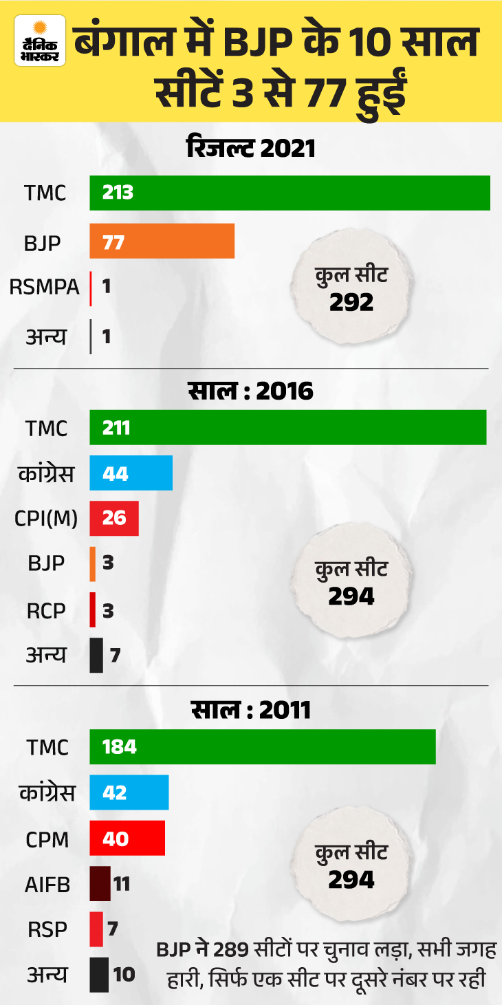 डॉ. धनपत राम अग्रवाल, स्वदेशी जागरण मंच के अखिल भारतीय सह संयोजक हैं। ये संगठन RSS से जुड़ा है और पश्चिम बंगाल में एक्टिव है। डॉ. अग्रवाल बताते हैं, ‘BJP को 2021 में ही सरकार बनाने की उम्मीद थी। उसे 2019 के लोकसभा चुनाव में 18 सीटें मिली थीं। लोकसभा की एक सीट पर विधानसभा की एवरेज 7 सीटें होती हैं। पार्टी का गणित था कि विधानसभा चुनाव में 18×7 यानी 126 सीटेें मिल जाएंगी। रिजल्ट उम्मीद के मुताबिक नहीं रहा और सिर्फ 77 सीटें मिलीं।’