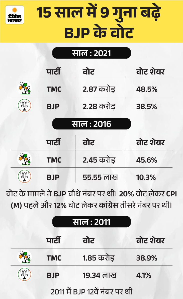 ‘पिछले 5 साल में ममता सरकार पर भ्रष्टाचार के आरोप लगे, लेकिन BJP बड़ा आंदोलन खड़ा नहीं कर पाई। पार्टी के सीनियर नेता मानते रहे कि गुजरात या मध्य प्रदेश में बिना किसी आंदोलन के सरकार बनी। ऐसे में बंगाल में आंदोलन से फायदा नहीं होगा, लेकिन यहां की राजनीति में आंदोलन जरूरी होते हैं। इसी वजह से BJP का संगठन मजबूत नहीं हो सका।’