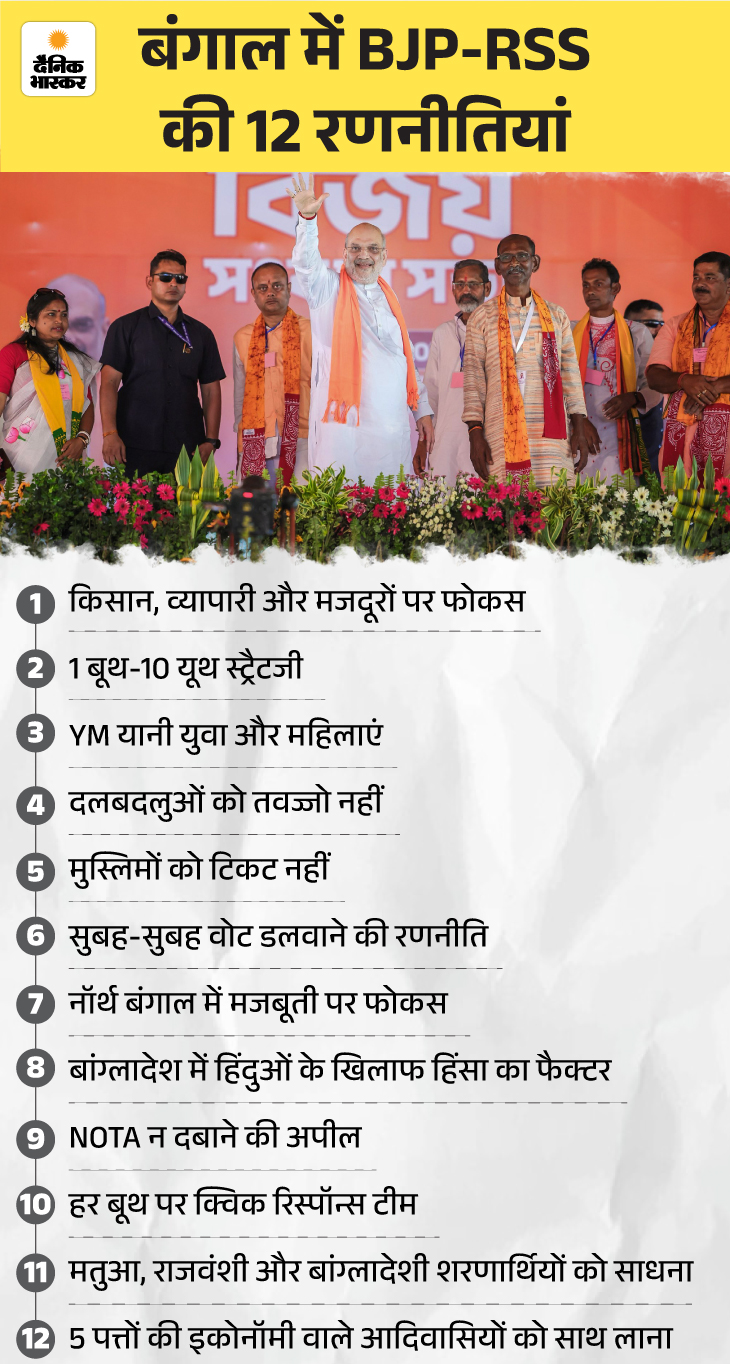 क्या है BJP-RSS की 12 रणनीतियां, जो बंगाल की राजनीति का समीकरण बदल सकती है, यही समझने के लिए हम कोलकाता पहुंचे। राज्य के अलग-अलग हिस्सों का चुनावी माहौल देखा। इसे जितना समझने की कोशिश की, तस्वीर उतनी ही उलझती गई।