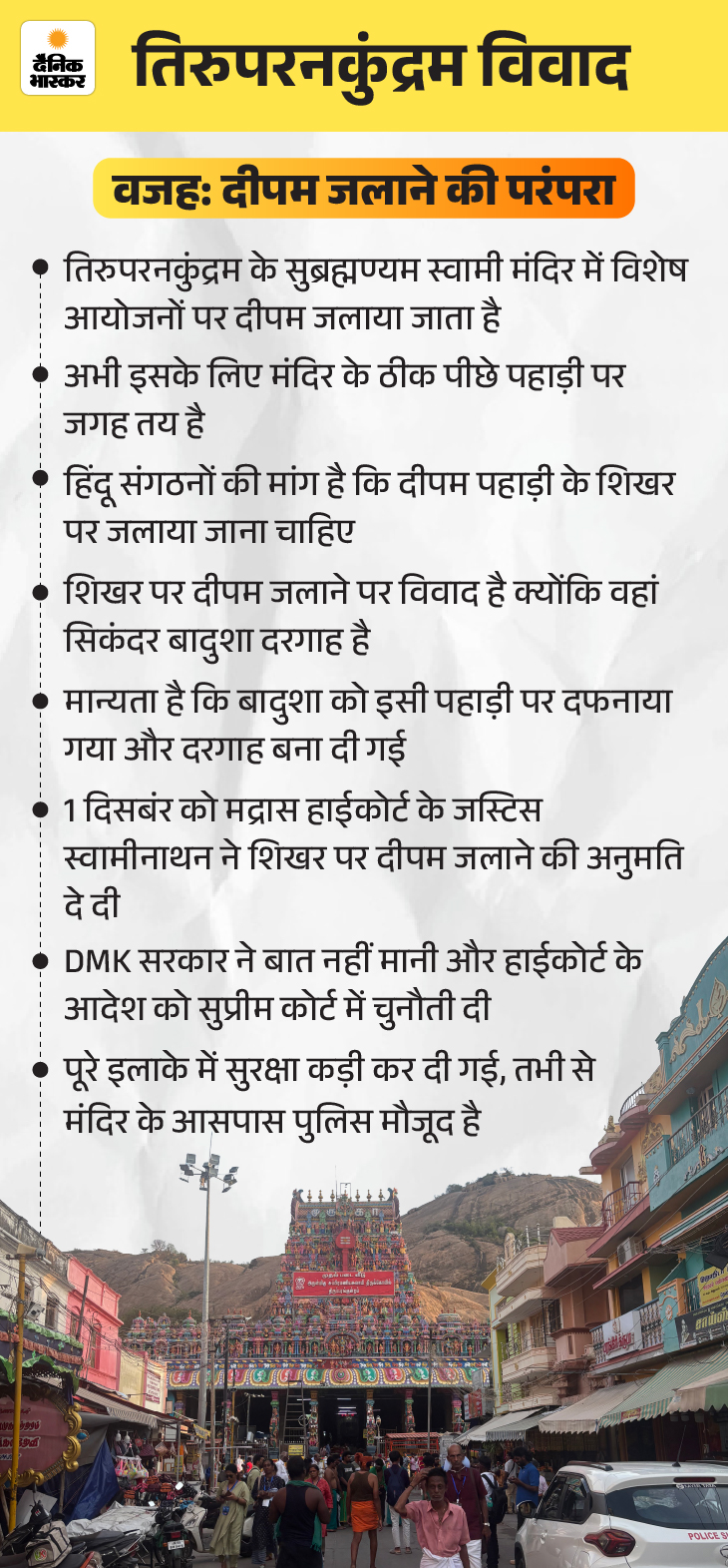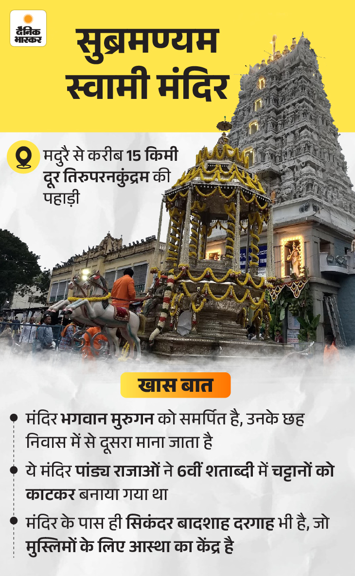 मदुरै से करीब 15 किमी दूर तिरुपरनकुंद्रम पहाड़ी है। इसकी तलहटी में भगवान मुरुगन का मंदिर है और शिखर पर सूफी संत सिकंदर बदुशा की दरगाह। दरगाह के पास दीपम (कांसे से बना बड़ा दीपक) जलाने के विवाद से ये इलाका दक्षिण भारत का ‘अयोध्या’ बन चुका है। बीते 6 मह