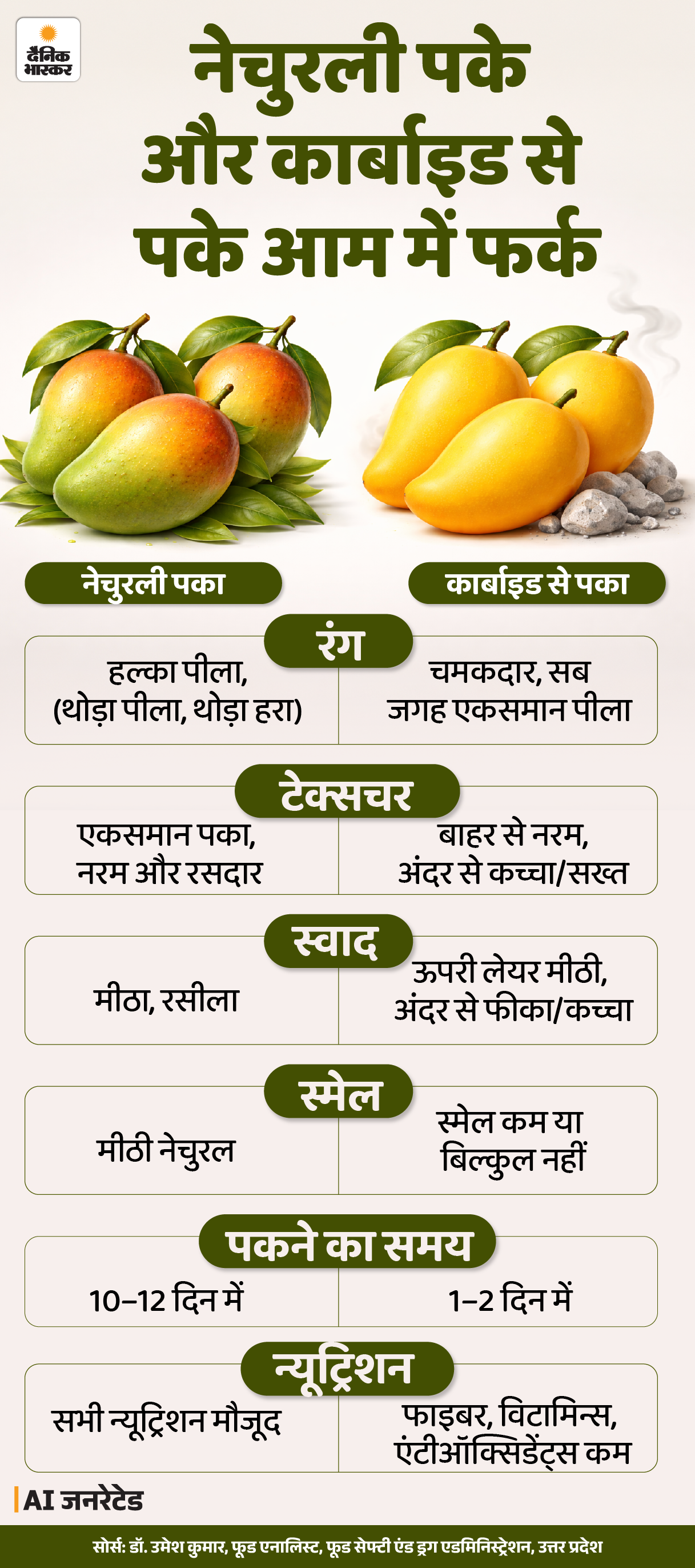 जवाब- कार्बाइड से पके आम और नेचुरली पके आम में स्वाद, न्यूट्रिशन और क्वालिटी का फर्क होता है। इसे ग्राफिक से समझिए-