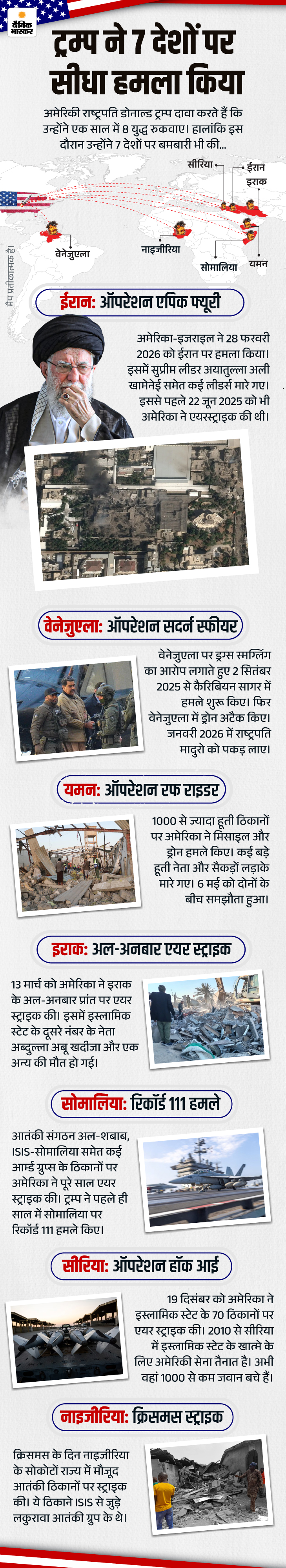 डोनाल्ड ट्रम्प को राष्ट्रपति पद की शपथ लिए 13 महीने हुए हैं। इस दौरान ट्रम्प ने 7 देशों पर सैन्य हमले किए, ईरान के सुप्रीम लीडर को मार गिराया, वेनेजुएला के राष्ट्रपति को तो घर से उठवा लिया, दर्जनों देशों पर अनाप-शनाप टैरिफ लगाए और राष्ट्राध्यक्षों को