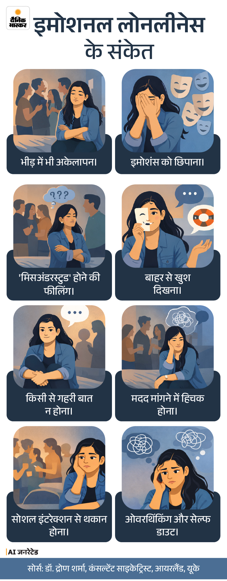 उदाहरण के तौर पर, कोई व्यक्ति संयुक्त परिवार में रह सकता है, कॉलेज में उसके कई दोस्त हो सकते हैं और वह अक्सर लोगों से घिरा रह सकता है। इसके बावजूद यदि उसके भीतर लगातार खालीपन, दूरी या “कोई मुझे समझता नहीं” जैसी भावना बनी रहती है, तो यह इमोशनल लोनलीनेस का संकेत है।