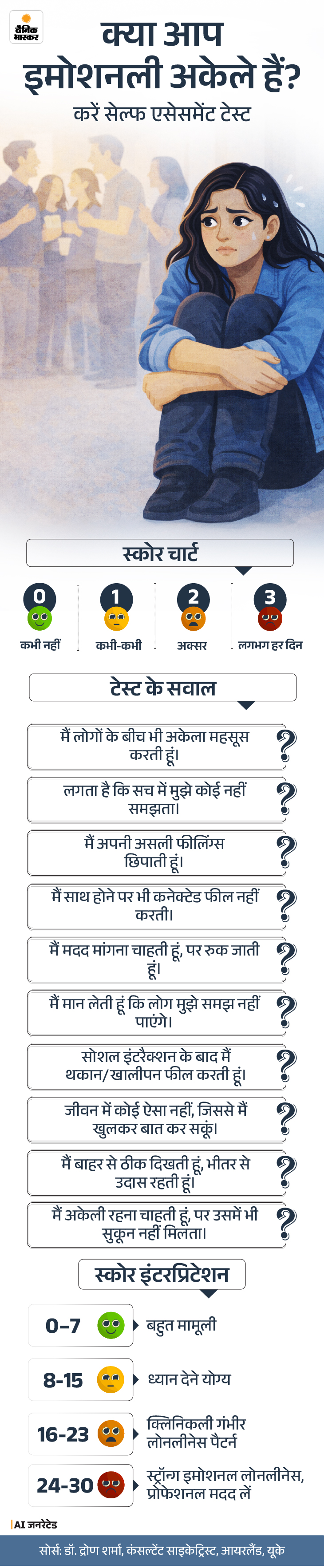नंबर के हिसाब से उसका इंटरप्रिटेशन भी ग्राफिक में दिया है। अगर आपका टोटल स्कोर 0 से 7 के बीच है तो आप में बहुत मामूली पैटर्न है। ये नॉर्मल है लेकिन अगर आपका स्कोर 24 से 30 के बीच है तो यह बहुत स्ट्रॉन्ग इमोशनल लोनलीनेस का संकेत है। ऐसे में प्रोफेशनल हेल्प के बारे में सोचना चाहिए। डिटेल टेस्ट नीचे ग्राफिक में देखिए।