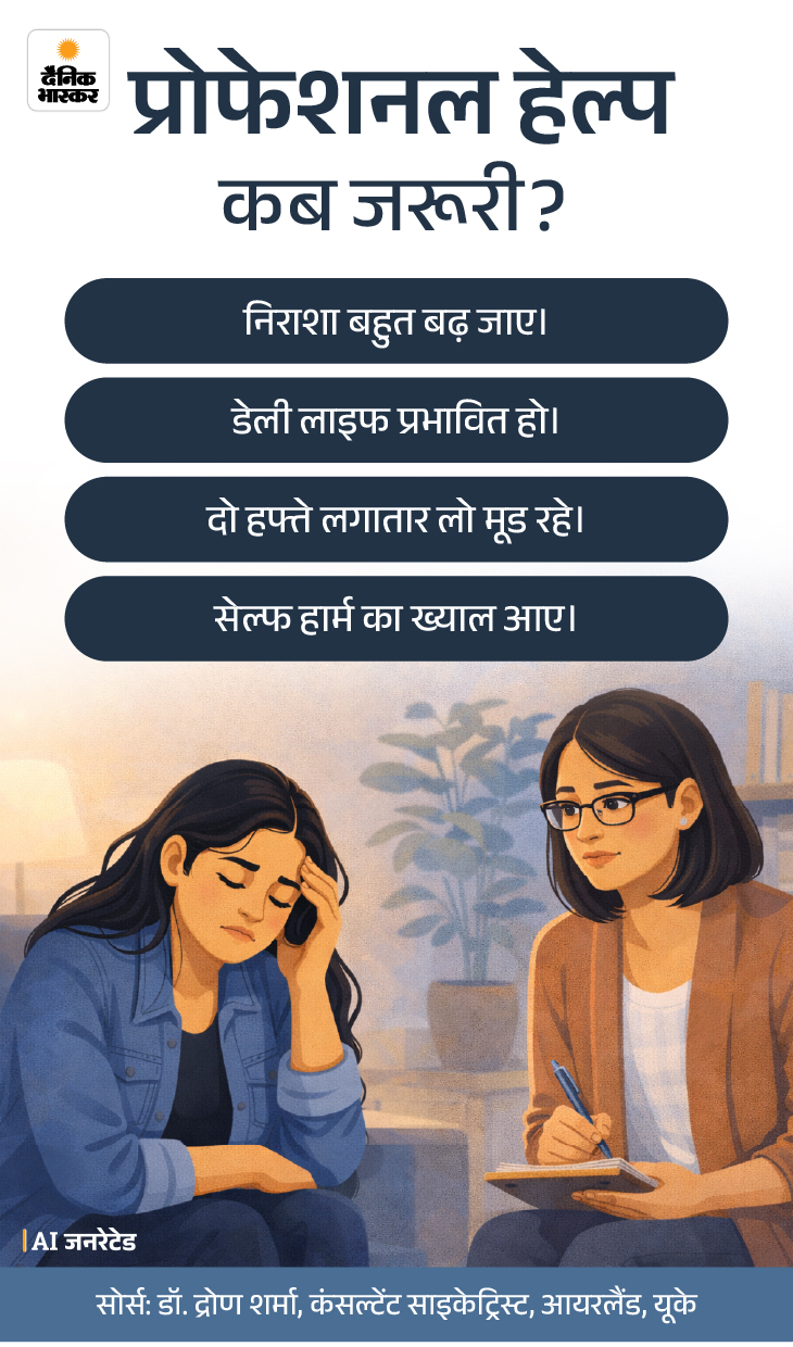 यदि आपका उत्तर “हां” है, तो यहां पर लो मूड/डिप्रेशन को भी एक बार प्रोफेशनल लेंस से जरूर देखना चाहिए। HSE (हेल्थ एंड सेफ्टी एक्जीक्यूटिव, यूके) और NHS (नेशनल हेल्थ सर्विस, यूके), दोनों सलाह देते हैं कि अगर 2 हफ्ते से अधिक समय तक लगातार लो मूड रहे, कोप करने में कठिनाई हो, या सेल्फ हेल्प से कोई फायदा न हो तो प्रोफेशनल हेल्प लेनी चाहिए.