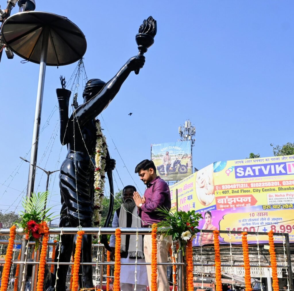 धनबाद | 15 नवंबर 2025भगवान बिरसा मुंडा की 150वीं जयंती और झारखंड राज्य स्थापना दिवस के अवसर पर धनबाद में विशेष उत्सव का वातावरण देखने को मिला। बैंक मोड़ स्थित बिरसा चौक पर स्थापित भगवान बिरसा मुंडा की आदमकद प्रतिमा पर उपायुक्त सह जिला दंडाधिकारी आदित्य रंजन समेत वरिष्ठ अधिकारियों ने पुष्प अर्पित कर श्रद्धांजलि दी।
