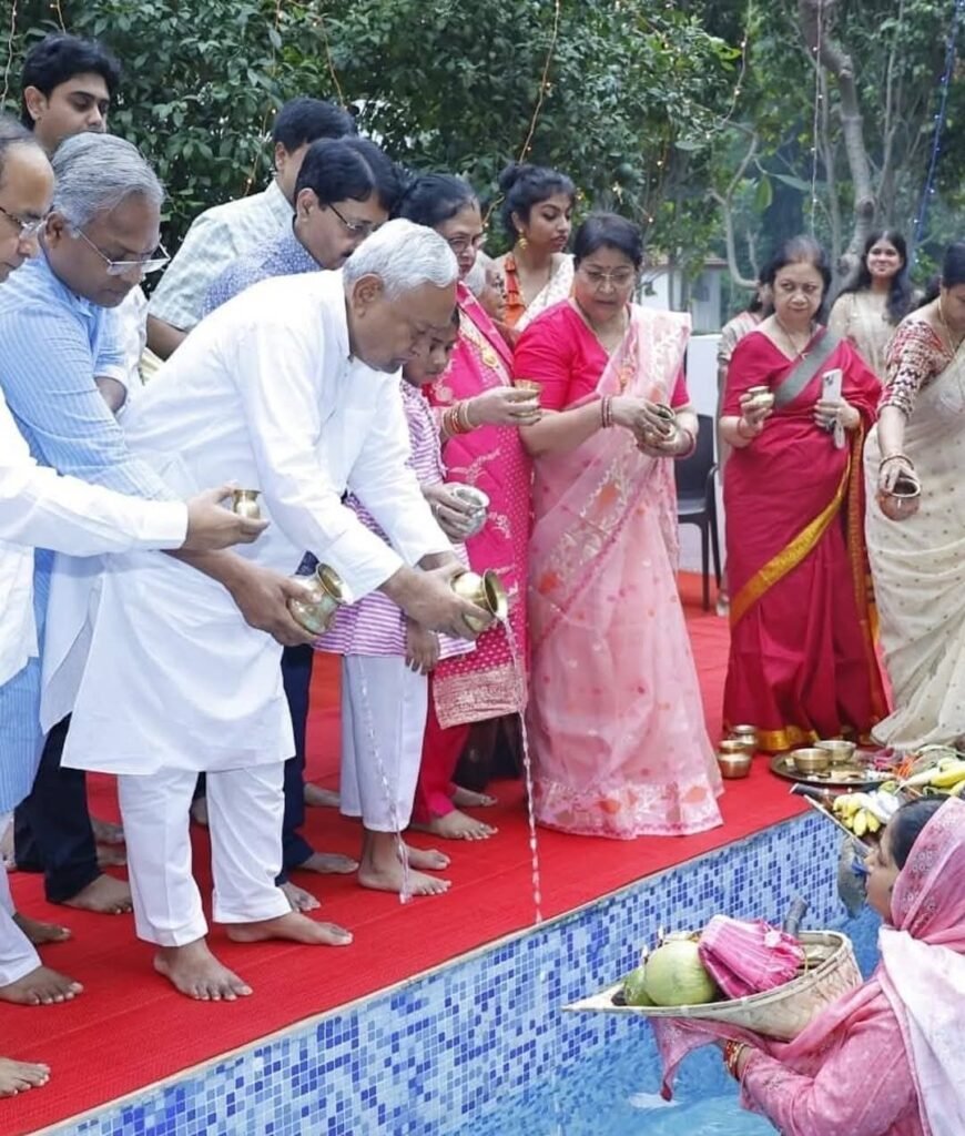 🏛️ नीतीश कुमार ने पटना में की पूजा, राज्य की खुशहाली की मांगी कामनाबिहार के मुख्यमंत्री नीतीश कुमार ने पटना स्थित अपने आवास 1 अणे मार्ग पर परिवार के साथ छठ पूजा मनाई। उन्होंने अस्ताचलगामी भगवान सूर्य को अर्घ्य अर्पित कर बिहार में शांति, सौहार्द और समृद्धि की प्रार्थना की।