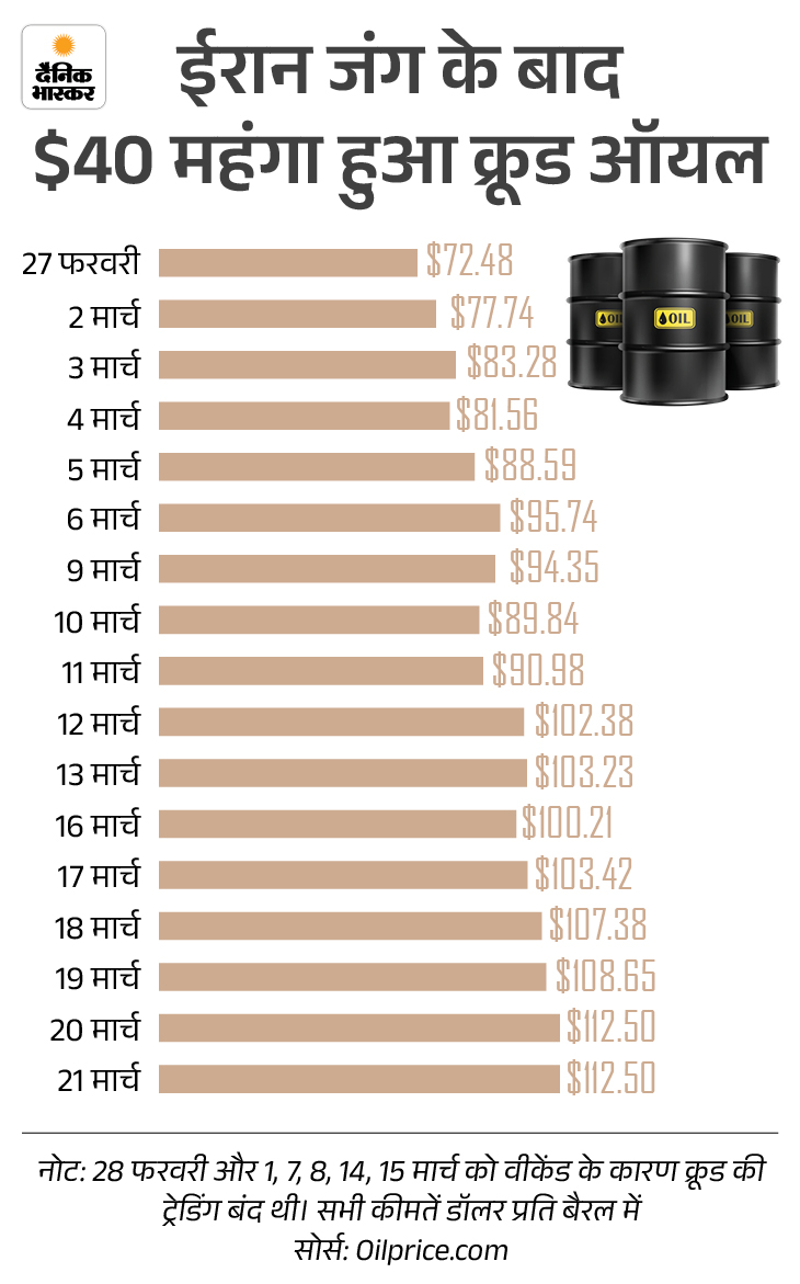 अमेरिका-इजरायल और ईरान के बीच बढ़ते तनाव के कारण पिछले कुछ समय से अंतरराष्ट्रीय बाजार में कच्चे तेल की कीमतों में उतार-चढ़ाव देखा जा रहा है। ब्रेंट क्रूड आज 112 डॉलर प्रति बैरल पर कारोबार कर रहा है। बीते दिनों ये 120 डॉलर प्रति बैरल तक पहुंच गया था।