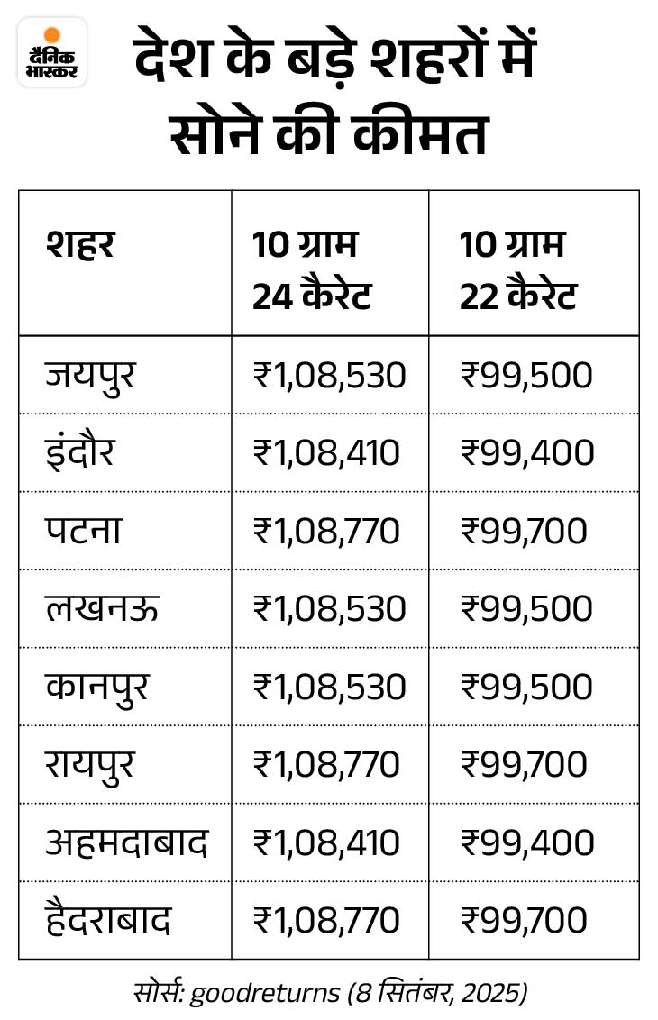 - भोपाल: 24 कैरेट सोने की कीमत ₹1,08,410 और 22 कैरेट सोने की कीमत ₹99,400