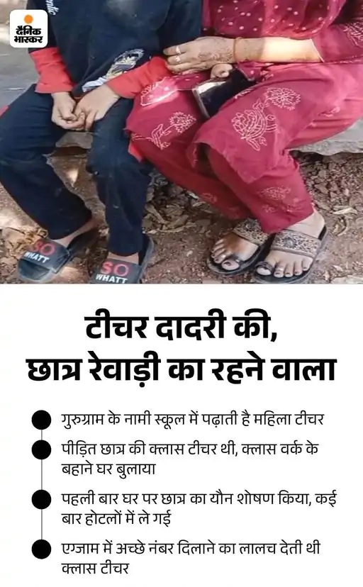 - अच्छे नंबर दिलाने का बहाना लगाकर घर बुलाती थी टीचर: चरखी दादरी की निवासी 40 साल की लेडी टीचर गुरुग्राम के निजी स्कूल में पढ़ाती थी। इसी स्कूल में रेवाड़ी का छात्र 12वीं में पढ़ता था। छात्र के परिजनों की शिकायत के अनुसार, लेडी टीचर छात्र की क्लास टीचर थी। वह एग्जाम में अच्छे नंबर दिलाने का लालच देकर छात्र को घर बुलाती थी।