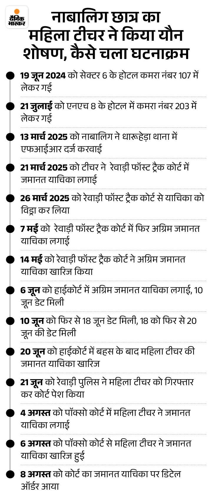 वहीं, टीचर के वकील ने कोर्ट में कहा कि महिला अब यौन शोषण के पीड़ित स्टूडेंट से 50 किलोमीटर दूर रहेगी, क्योंकि अब उसका परिवार रेवाड़ी से चरखी दादरी शिफ्ट हो गया है।