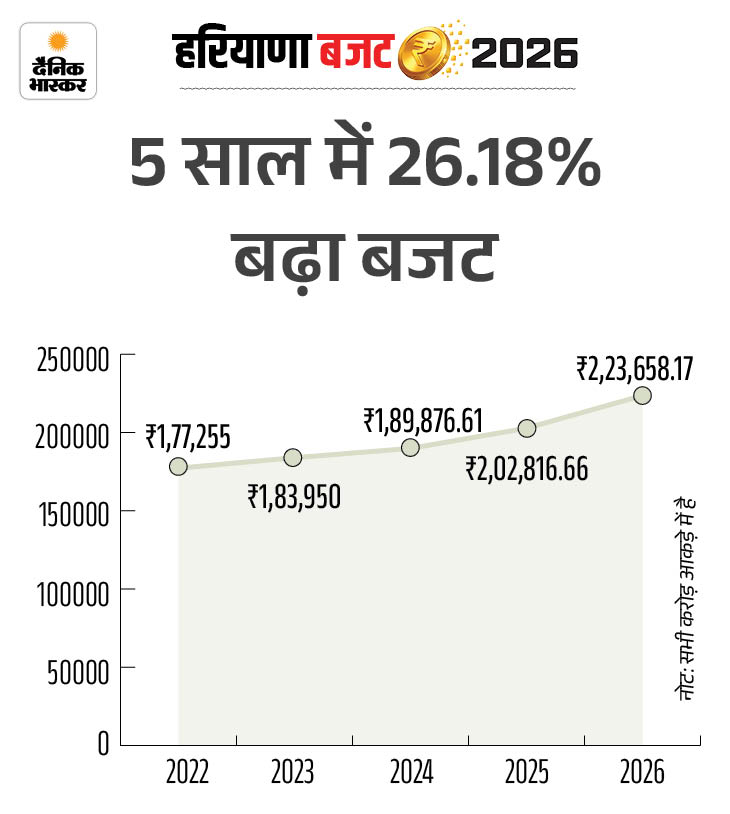 CM नायब सैनी ने कहा कि मैं वर्ष 2026-27 के लिए कुल ₹2,23,658.17 करोड़ का बजट प्रस्तावित करता हूं, जो वर्ष 2025-26 के संशोधित आंकड़े ₹2,02,816.66 करोड़ से 10.28% अधिक है।