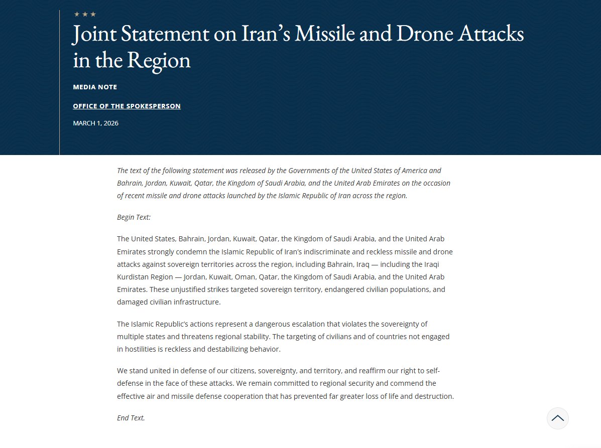 अमेरिकी विदेश विभाग ने एक कड़े बयान में कहा है कि अमेरिका, बहरीन, जॉर्डन, कुवैत, कतर, सऊदी अरब और संयुक्त अरब अमीरात ने मिलकर ईरान के हमलों की कड़ी निंदा की है।