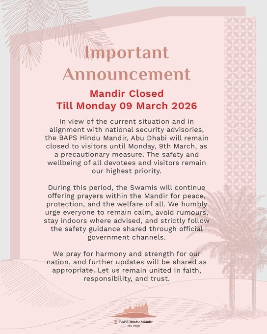 अबू धाबी के BAPS हिंदू मंदिर ने नेशनल सिक्योरिटी एडवाइज़री को देखते हुए इसे एहतियात के तौर पर सोमवार, 9 मार्च तक विजिटर्स के लिए बंद रखने का फैसला किया है। मंदिर प्रशासन द्वारा जारी बयान के अनुसार, इस अवधि के दौरान मंदिर के अंदर शांति और सबकी भलाई के लिए विशेष प्रार्थनाएं जारी रहेंगी। मिडिल ईस्ट में बढ़ते तनाव के बीच सुरक्षा सुनिश्चित करने के लिए यह कदम उठाया गया है।