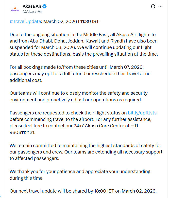 अकासा एयर ने X पोस्ट में लिखा – मिडिल ईस्ट में चल रहे हालात की वजह से, अबू धाबी, दोहा, जेद्दा, कुवैत और रियाद आने-जाने वाली अकासा एयर की सभी फ्लाइट्स 3 मार्च के लिए सस्पेंड कर दी गई हैं। 7 मार्च तक इन शहरों के लिए की गई सभी बुकिंग के लिए, यात्री बिना किसी एक्स्ट्रा चार्ज के पूरा रिफंड ले सकते हैं या अपनी यात्रा रीशेड्यूल कर सकते हैं।