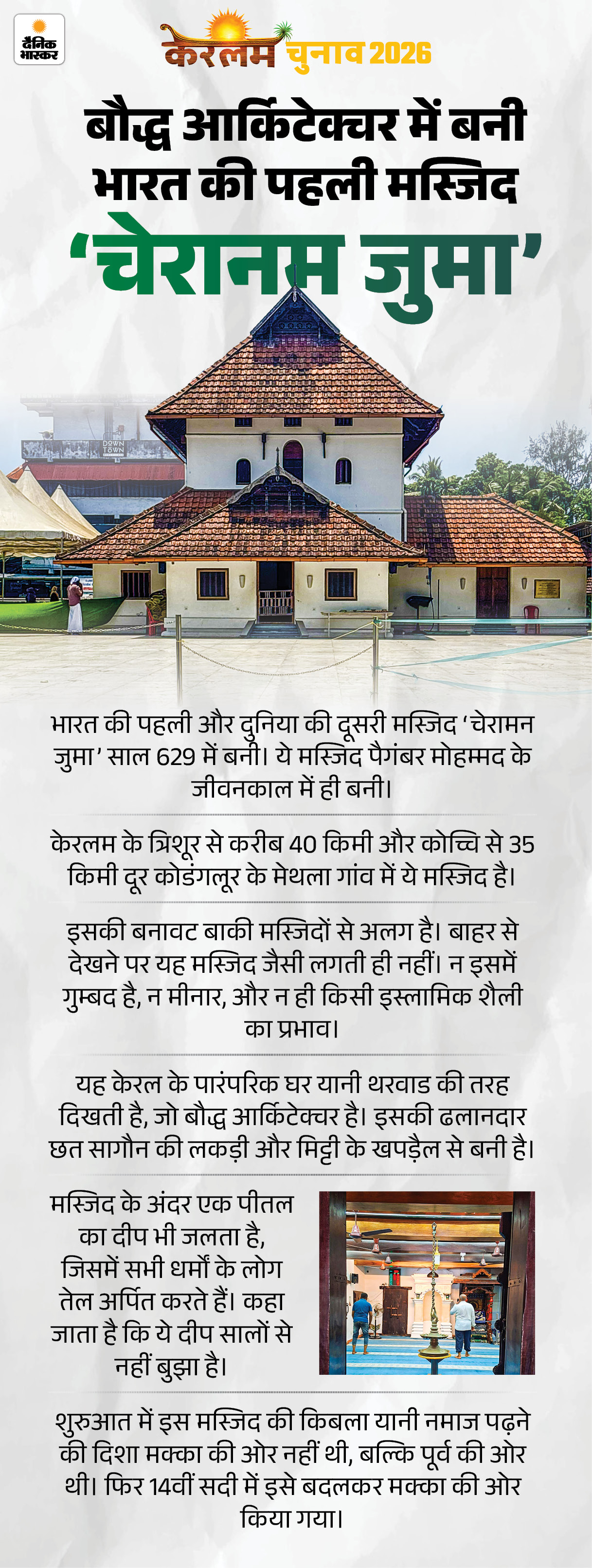 - चेरामन जुमा मस्जिद का असर आज भी केरलम की राजनीति, समाज और कारोबार में दिखता है। राज्य की आबादी में 55% हिंदू, 26.5% मुस्लिम और 18.4% ईसाई हैं।