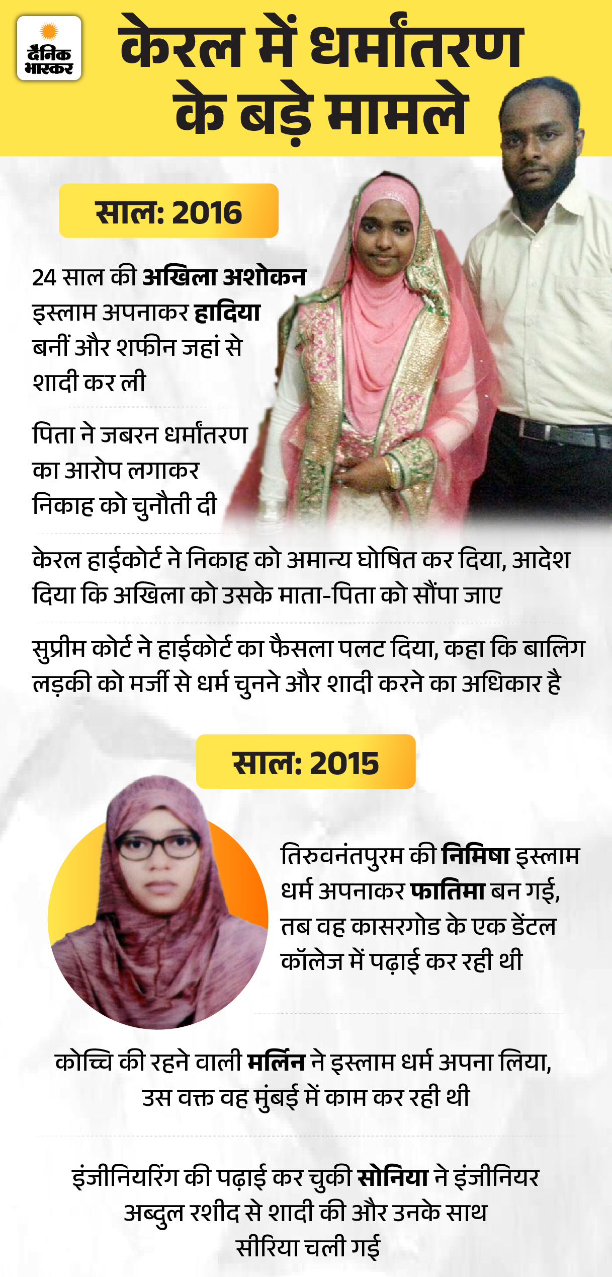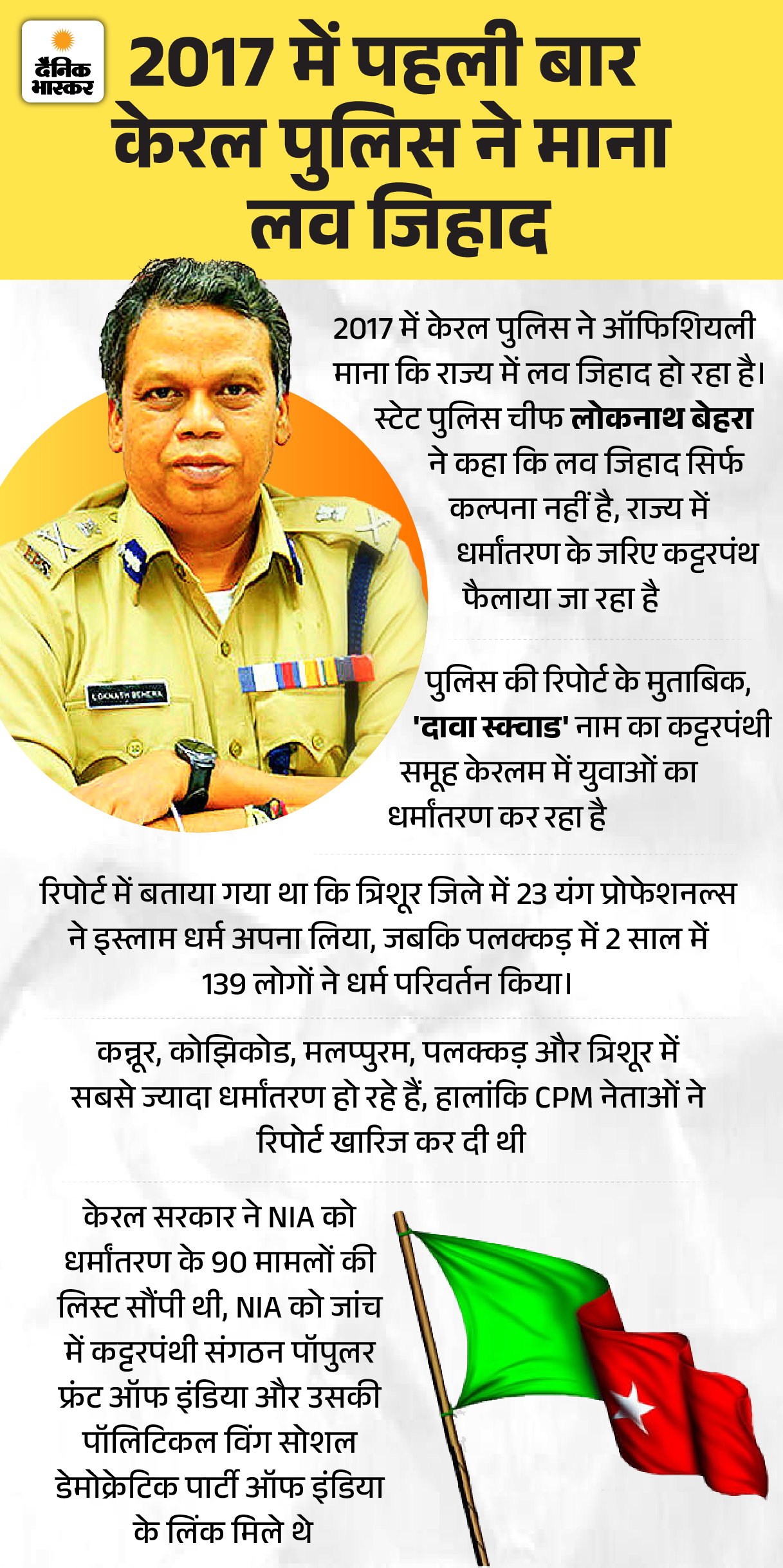 केरलम के 6 जिलों कासरगोड, कोझिकोड, त्रिशूर, मलप्पुरम, कन्नूर और पलक्कड़ में धर्म परिवर्तन के सबसे ज्यादा मामले आते हैं। इनमें त्रिशूर के अलावा सभी जिलों में 30% से ज्यादा मुस्लिम आबादी है। इन जिलों में केरलम की आधी, यानी 70 सीटें हैं। इनके अलावा एर्नाकुलम, तिरुवनंतपुरम और अलेप्पी के कुछ हिस्सों में भी ऐसे केस आते रहते हैं। BJP यहां CM पिनराई विजयन की बेटी की मुस्लिम से शादी करने का मुद्दा उठाती है।