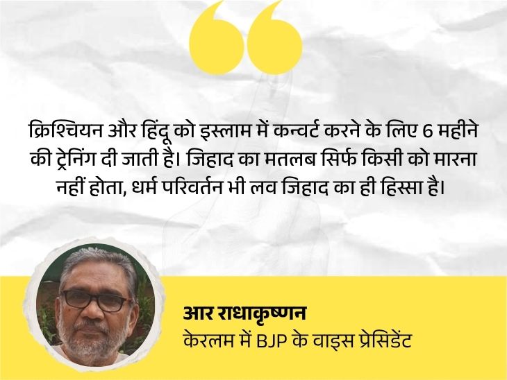 ‘BJP बोली- लव जिहाद के खिलाफ सभी हिंदू एक होकर BJP को वोट देंगे, ऐसा मुश्किल’ केरलम में BJP के वाइस प्रेसिडेंट आर राधाकृष्णन कहते हैं कि इस्लाम में लव जिहाद एक्सीडेंटल तरीके से नहीं आया है। कुरान में मुस्लिम की गैर मुस्लिम से शादी को अच्छा बताया गया है।