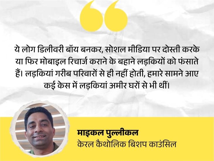 फादर बोले- क्रिश्चियन कम्युनिटी ज्यादा शिकार, डिलीवरी बॉय लड़कियों को फंसा रहे केरल कैथोलिक बिशप काउंसिल से जुड़े फादर माइकल पुल्लीकल बताते हैं कि द केरल स्टोरी के कैरेक्टर और स्टोरी काल्पनिक हो सकते हैं, लेकिन ये सब्जेक्ट रिलेवेंट है। केरलम में हिंदू ही नहीं क्रिश्चियन कम्युनिटी भी इसके शिकार हैं। फंडामेंटलिस्ट मुस्लिम ऑर्गेनाइजेशन जानबूझकर ये सब करवा रहे हैं। ज्यादातर केस में शादीशुदा मुस्लिम लड़के ही शामिल होते हैं।
