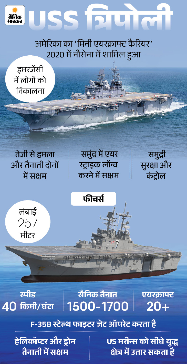 USS त्रिपोली एक ऐसा वॉरशिप है जो समुद्र से ही हवाई और जमीनी ऑपरेशन चला सकता है। इसमें F-35 स्टेल्थ फाइटर जेट, MV-22 ऑस्प्रे हेलीकॉप्टर और सैनिकों को किनारे तक पहुंचाने वाले विशेष जहाज मौजूद हैं।