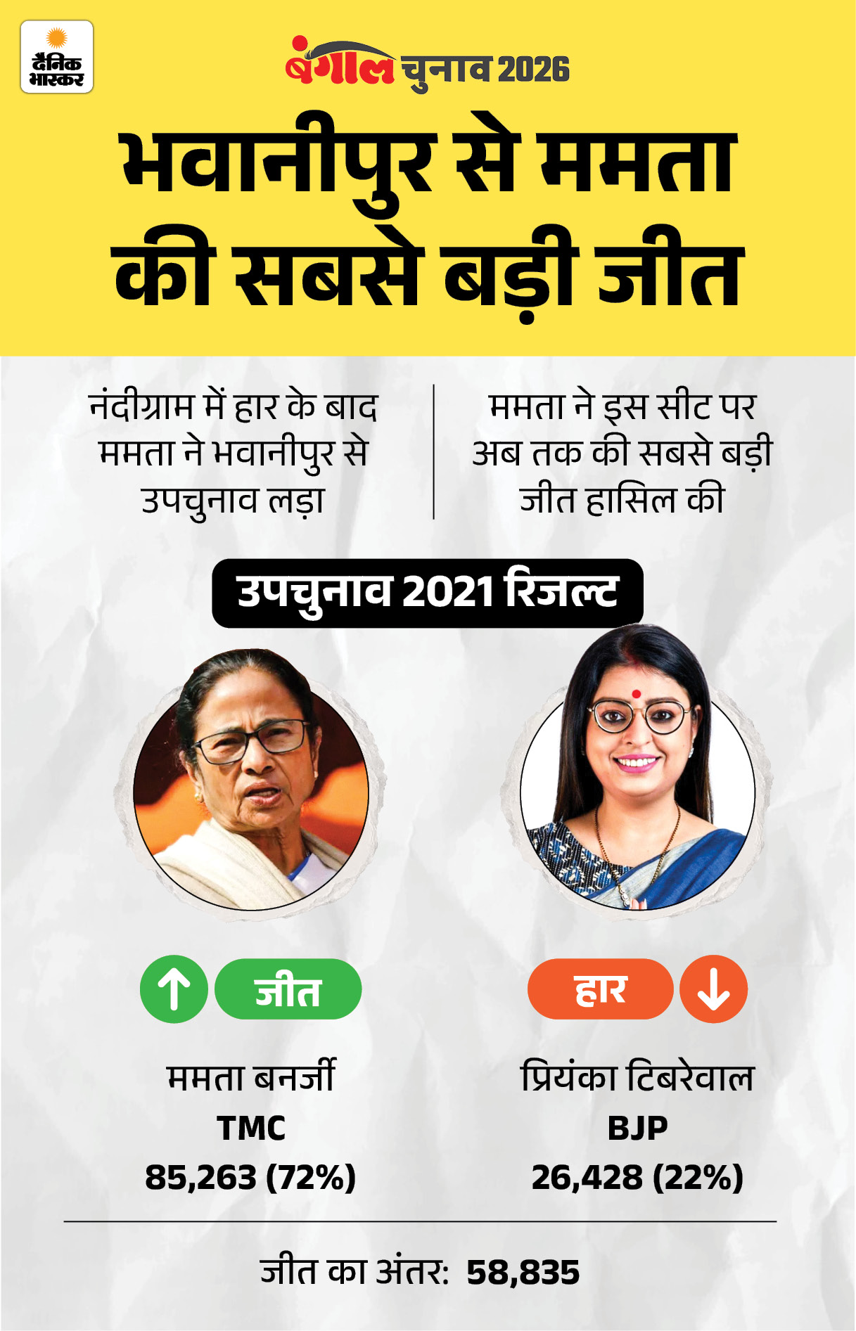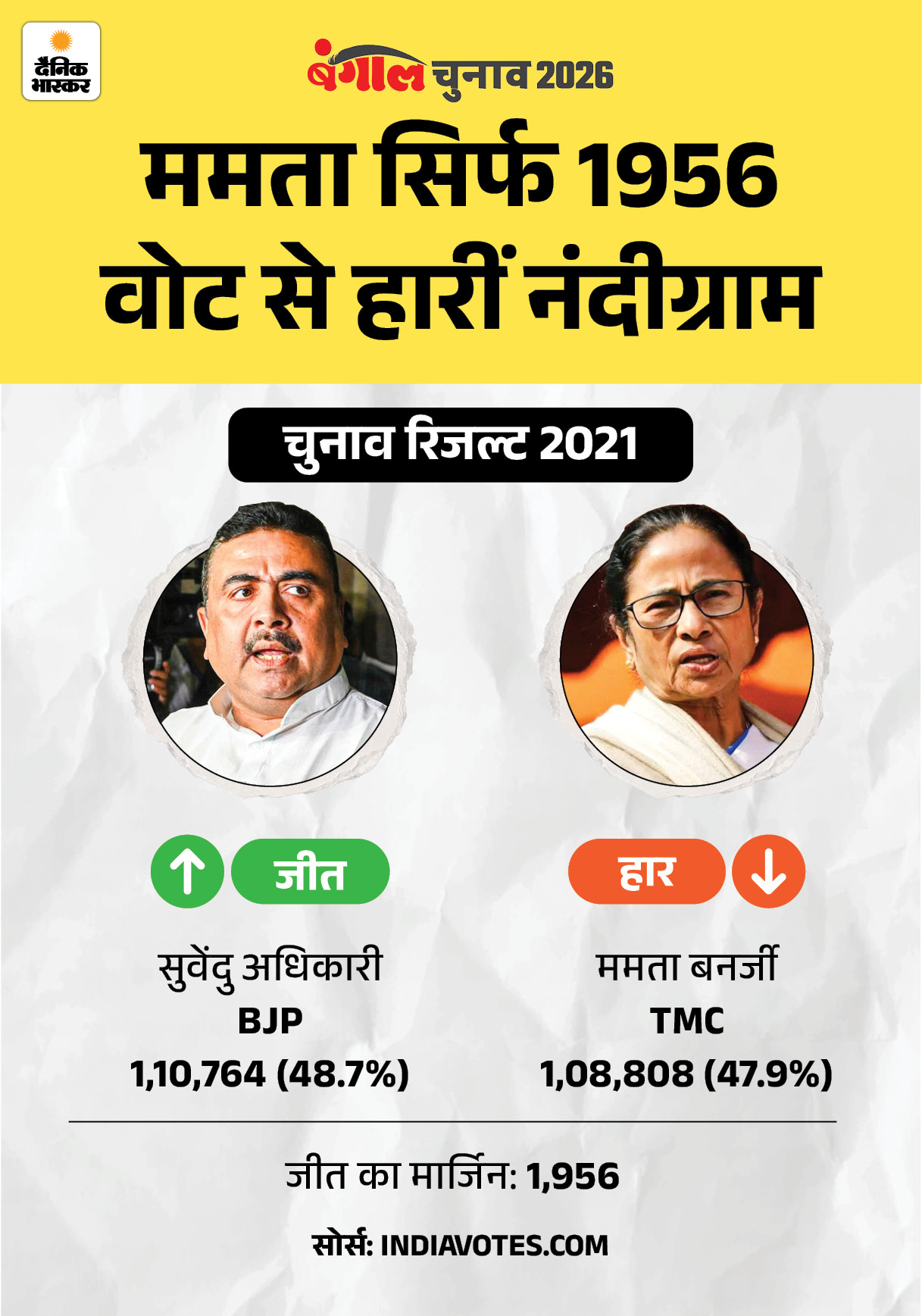 चुनाव में TMC ने 215 सीटें जीतकर बहुमत से सरकार बनाई, लेकिन ममता नंदीग्राम से BJP कैंडिडेट सुवेंदु अधिकारी से हार गईं। फिर भवानीपुर सीट से उपचुनाव लड़ा और जीतकर तीसरी बार CM बनीं।।