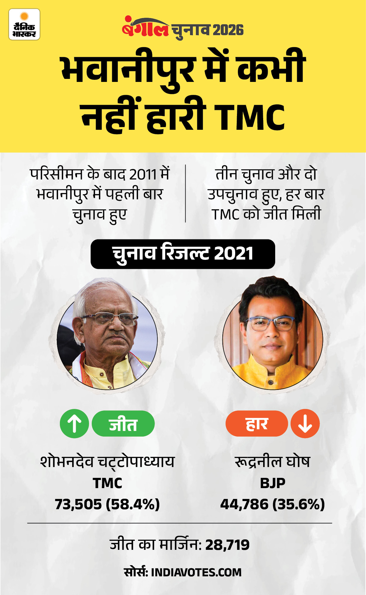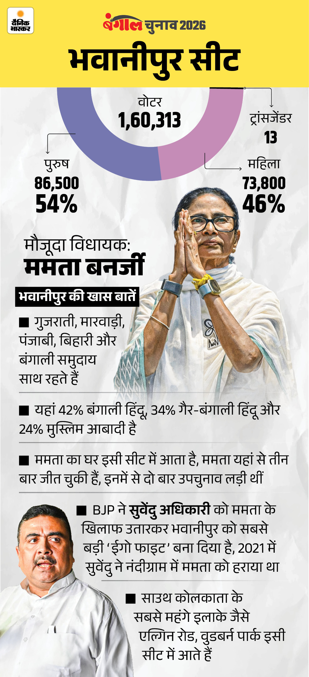 एक्सपर्ट बोले- 25% मुस्लिम वोटर अहम, मिडिल क्लास वोटर से BJP को फायदा रवींद्र भारती यूनिवर्सिटी के प्रोफेसर बिस्वनाथ चक्रवर्ती कहते हैं, ‘भवानीपुर ममता बनर्जी का होम ग्राउंड है। यहां के ज्यादातर काउंसलर TMC से जुड़े हैं। करीब 25% मुस्लिम वोटर अहम भूमिका निभाते हैं, इसलिए शुरुआती बढ़त ममता के पास है।’