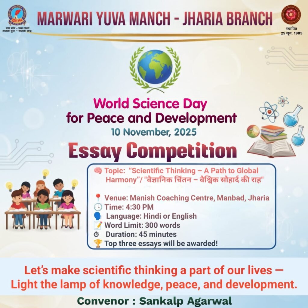धनबाद, 10 नवंबर 2025:विश्व विज्ञान दिवस (World Science Day for Peace and Development) के अवसर पर मारवाड़ी युवा मंच, झरिया शाखा की ओर से सोमवार को मनीष कोचिंग सेंटर, मानबाद में निबंध लेखन प्रतियोगिता का आयोजन किया गया। प्रतियोगिता का विषय था — “वैज्ञानिक चिंतन – वैश्विक सौहार्द की राह” (Scientific Thinking – A Path to Global Harmony)।
