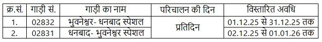 नया शेड्यूल इस प्रकार है —क्र.सं. गाड़ी संख्या ट्रेन का नाम चलने के दिन विस्तारित अवधि1 02832 भुवनेश्वर–धनबाद स्पेशल प्रतिदिन 01 दिसंबर 2025 से 31 दिसंबर 20252 02831 धनबाद–भुवनेश्वर स्पेशल प्रतिदिन 02 दिसंबर 2025 से 01 जनवरी 2026