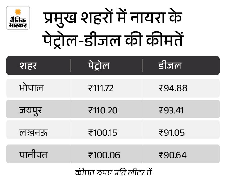 ईरान जंग के बीच नायरा एनर्जी का पेट्रोल ₹5 प्रति लीटर और डीजल में ₹3 महंगा हो गया है। अब भोपाल में पेट्रोल की कीमत 111.72 रुपए और डीजल 94.88 रुपए पर पहुंच गया है।
