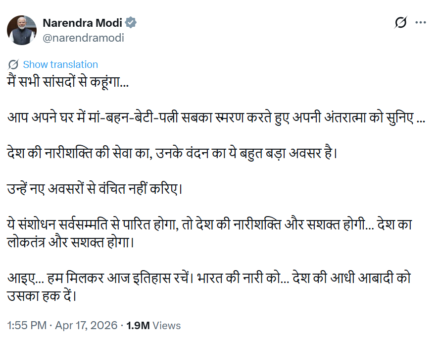 17 अप्रैल को दोपहर करीब 2 बजे प्रधानमंत्री नरेंद्र मोदी ने सोशल मीडिया X पर 2 पोस्ट किए। उनमें लिखा कि कुछ ही देर में मतदान होने वाला है। मैं सभी राजनीतिक दलों से आग्रह करता हूं कि महिला आरक्षण के पक्ष में मतदान करें। देश की आधी आबादी को उसका हक दें।