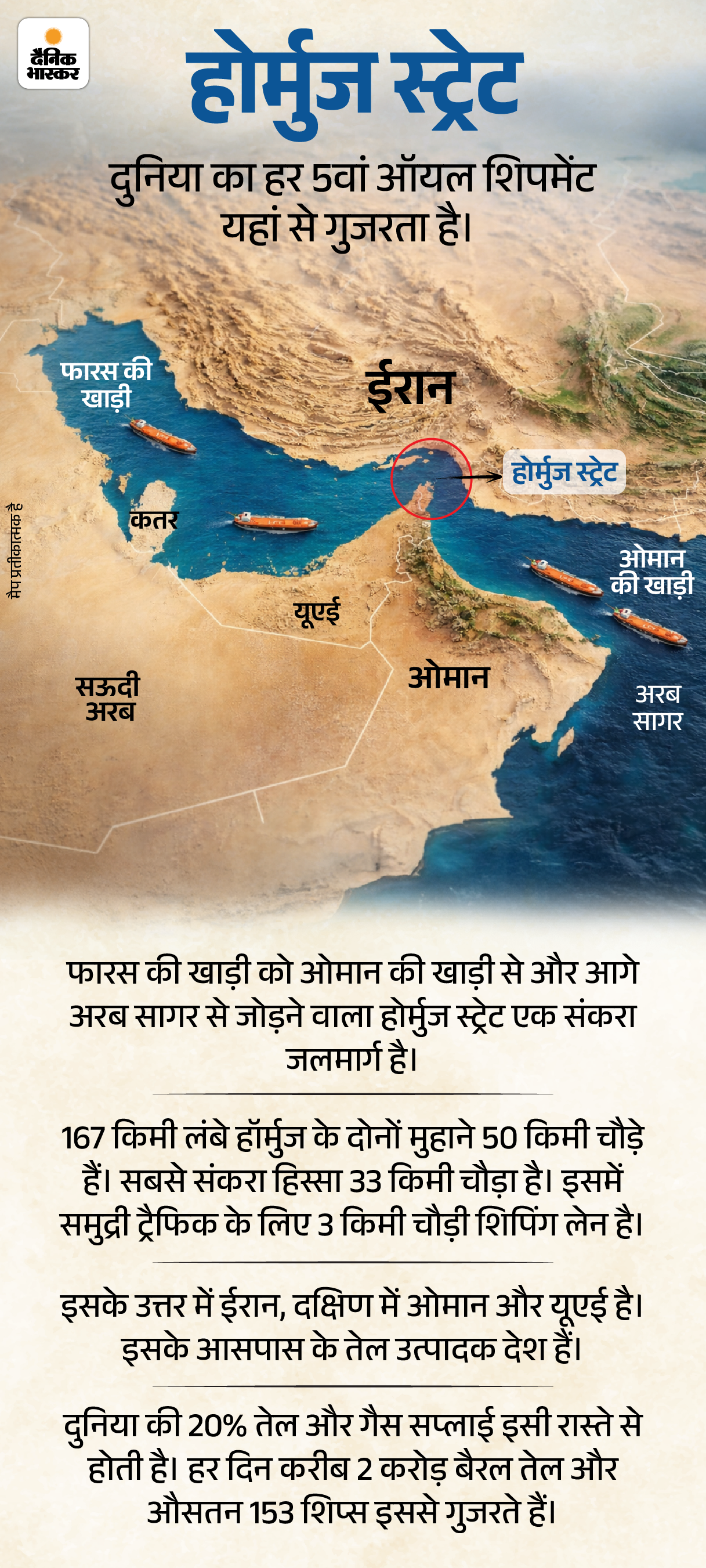 होर्मुज स्ट्रेट करीब 167 किमी लंबा जलमार्ग है, जो फारस की खाड़ी को अरब सागर से जोड़ता है। ईरान जंग के कारण यह रूट अब सुरक्षित नहीं है। खतरे को देखते हुए कोई भी तेल टैंकर वहां से नहीं गुजर रहे।