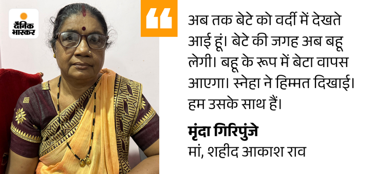 कहा- बेटा कोई भी काम नामुमकिन नहीं है। तुम्हारे पिता ने यही सिखाया है। भास्कर के साथ चर्चा में स्नेहा ने कई सवालों के जवाब तो दिए ही साथ ही अपने पति शहीद एएसपी आकाश से जुड़ी कई और बातें भी बताईं पढ़िए पूरा इंटरव्यू:-