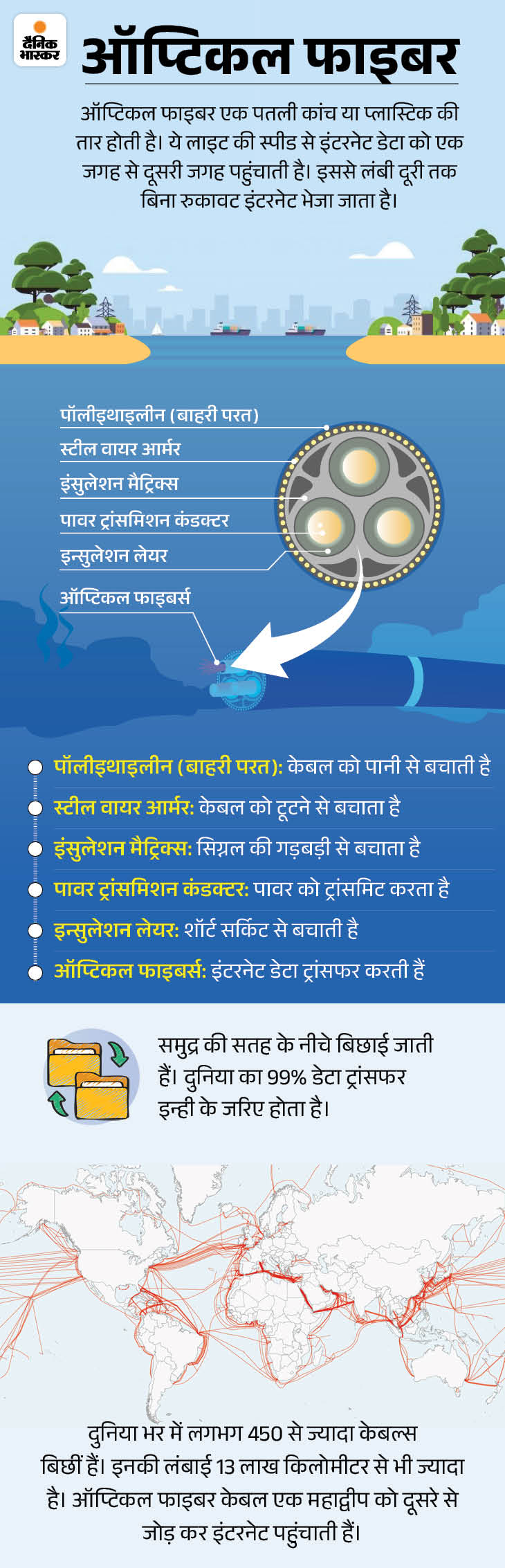 रेड सी में ऑप्टिक फाइबर केबलों के कटने से दुनियाभर का 17% इंटरनेट ट्रैफिक प्रभावित हो गया है। ये ऑप्टिक फाइबर केबल माइक्रोसॉफ्ट के क्लाउड प्लेटफॉर्म अजूर की थीं, जो यूरोप और एशिया को इंटरनेट प्रोवाइड करतीं हैं।