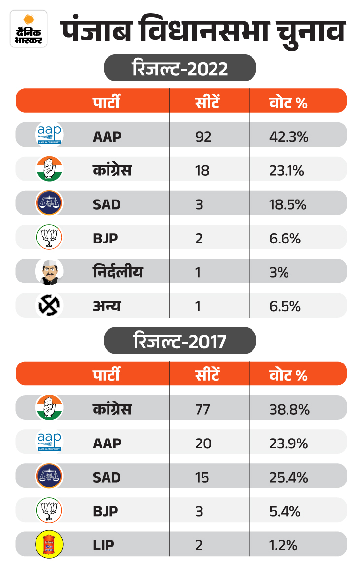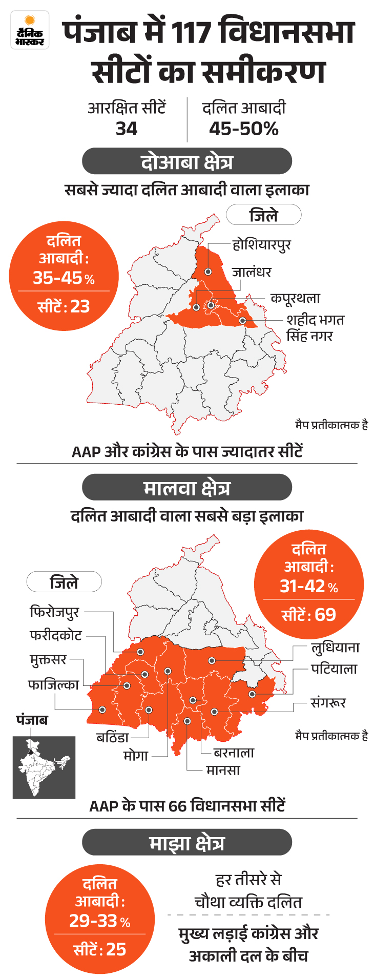 पंजाब की 117 विधानसभा सीटों में से 34 सीटें रिजर्व हैं। यहां दलित आबादी 45-50% है। इनमें दोआबा क्षेत्र की 23 सीटों पर दलितों का प्रभाव सबसे ज्यादा है। पंजाब का मालवा, दलित आबादी वाला सबसे बड़ा क्षेत्र है। यहां की 69 सीटों पर दलित आबादी 31 से 42% है। इस एरिया की की 66 सीटें AAP के पास हैं। BJP को पंजाब में ताकत बढ़ाने के लिए इसमें सेंध लगानी होगी।