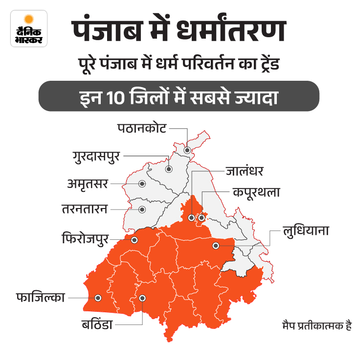 वैसे धर्म परिवर्तन का ट्रेंड पूरे पंजाब में है, लेकिन बार्डर इलाकों में ज्यादा है। इनमें गुरदासपुर के साथ अमृतसर, पठानकोट, फाजिल्का, तरनतारन, फिरोजपुर, लुधियाना, कपूरथला, बठिंडा और जालंधर जिले शामिल हैं।