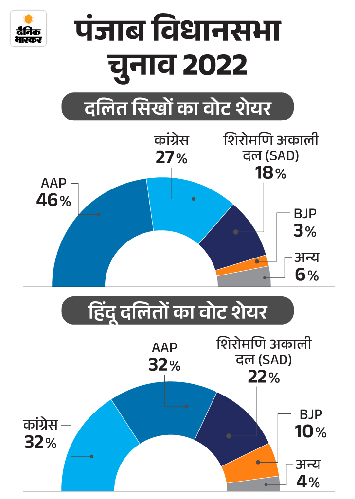 दलित वोटों के हिसाब से BJP कमजोर पंजाब में 2022 के विधानसभा चुनाव में दलितों का वोट शेयर देखें तो BJP कमजोर दिखती है। दलित सिखों का सबसे ज्यादा 46% वोट AAP को और सबसे कम 3% ही BJP को मिला। हिंदू दलितों का वोट शेयर देखें तो कांग्रेस को 32% और AAP को 32% वोट मिले, जबकि BJP का वोट शेयर 10% ही रहा।